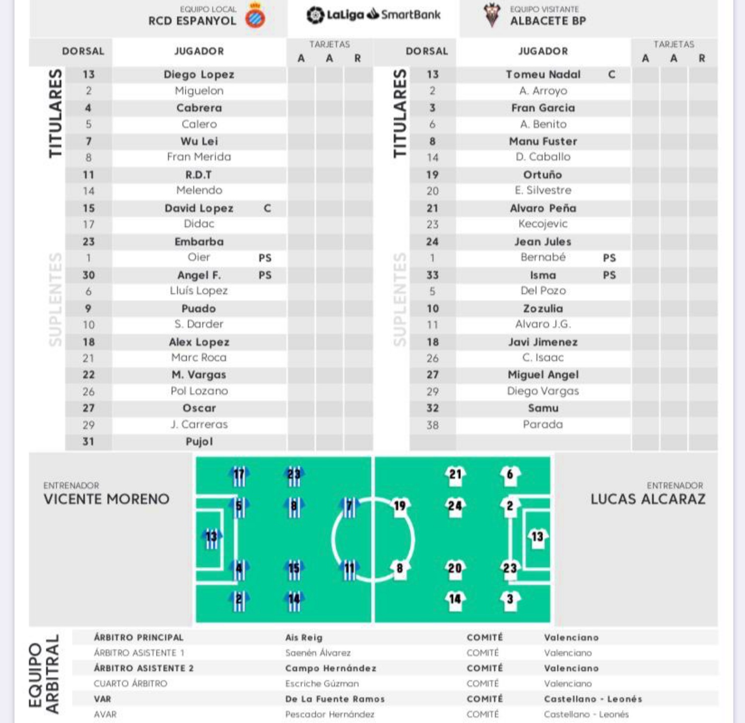 Albacete Balompié: Del Pozo por Eddy Silvestre (min 46), Roman Zozulia por Álvaro Peña (min 46), Álvaro Jiménez por Fran García (min 46) y Carlos Isaac por Alberto Benito (min 83).