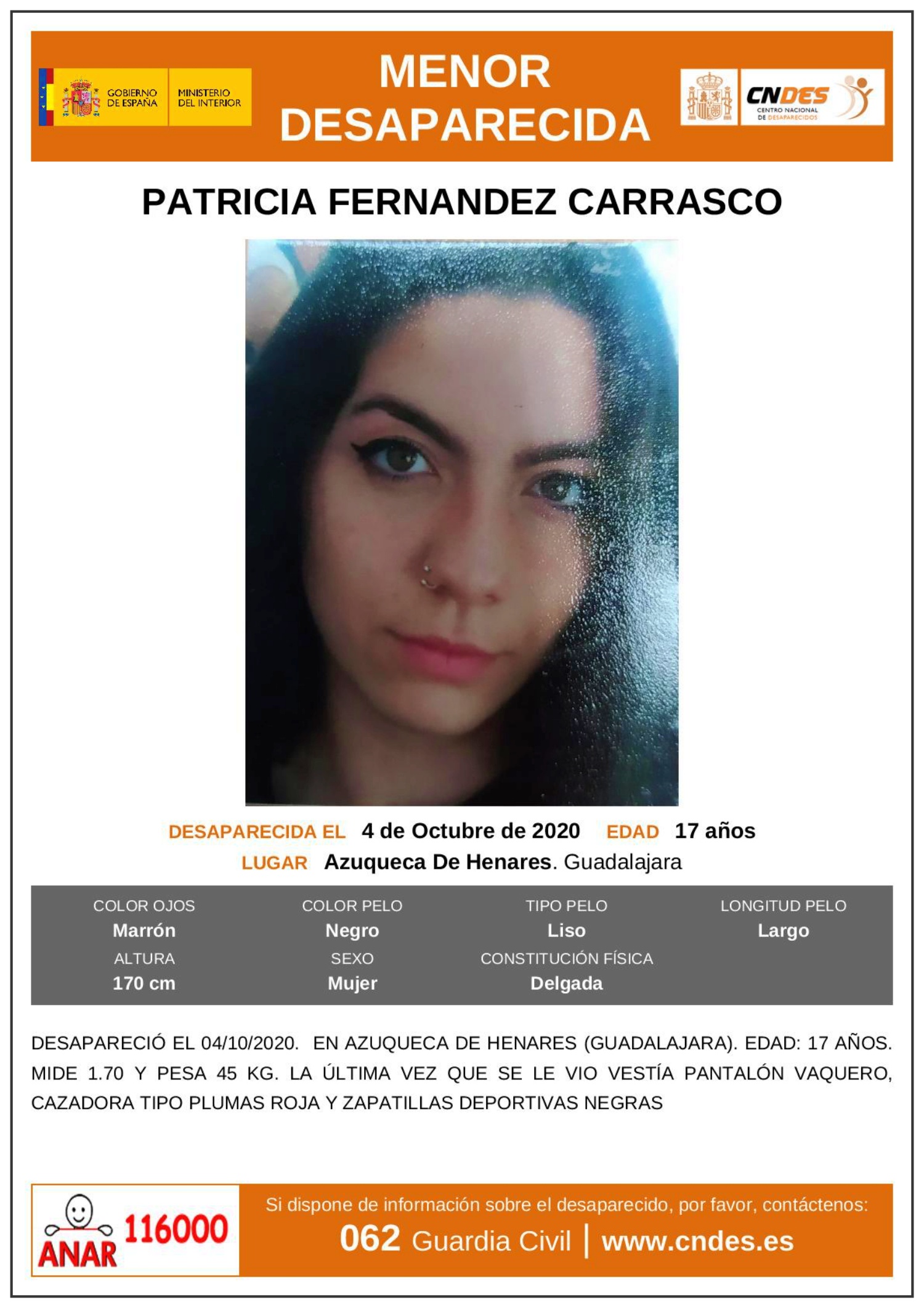 La Fuerzas y Cuerpos de Seguridad del Estado buscan a Patricia Fernández Carrasco, una joven de 17 años que lleva desaparecida desde el pasado domingo, en la localidad guadalajareña de Azuqueca de Henares.