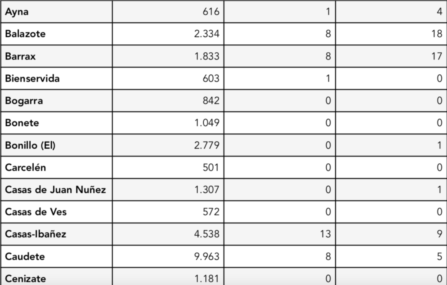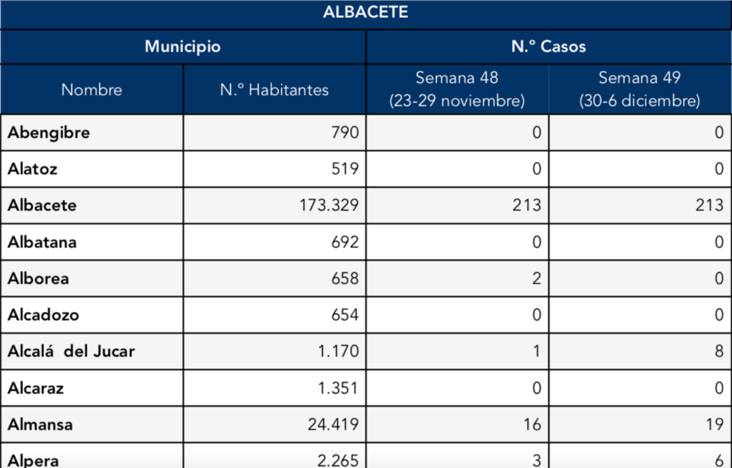 Salían a la luz en Alcalá del Júcar 8 casos entre los días 30 de noviembre y 6 de diciembre, cifra que aumentó ya que los nuevos contagios durante la última semana de noviembre no superaban los 2. Se contabilizaban también en Barrax 17 nuevos casos de COVID-19 en la primera semana de diciembre.