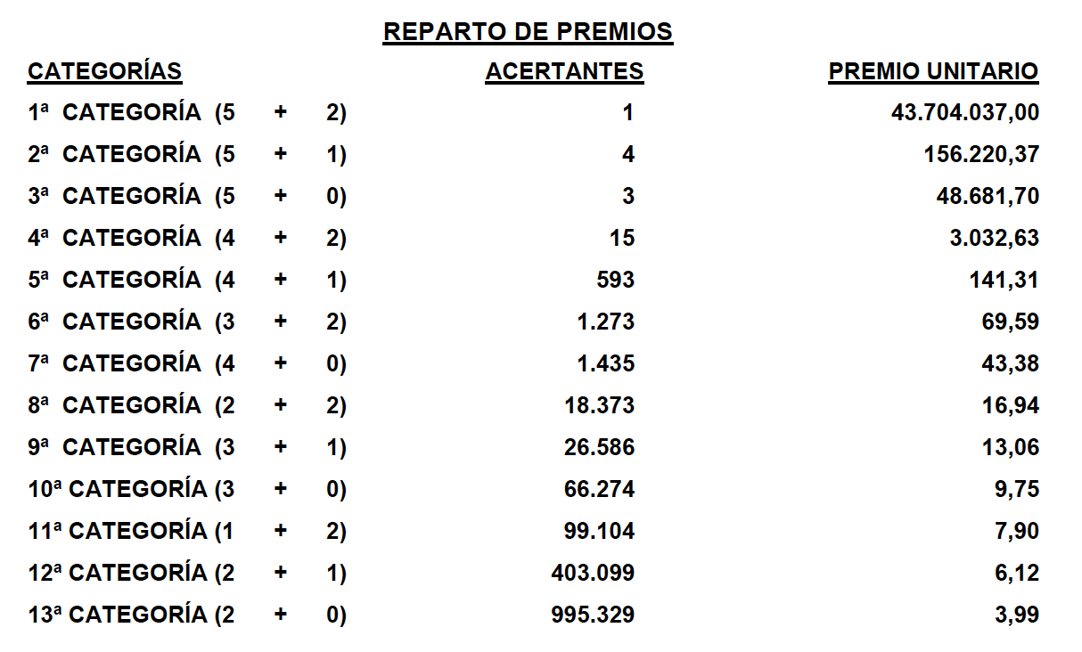 En ESPAÑA existen DOS boletos acertantes de Tercera Categoría (5 + 0) que han sido validados en la Administración de Loterías nº 1 de SANTA SUSANNA (Barcelona), situada en C.C. Susanna. L-11 Crta. Nacional Km. 673; y en la nº 33 de MADRID, situada en Peña Prieta, 47.
