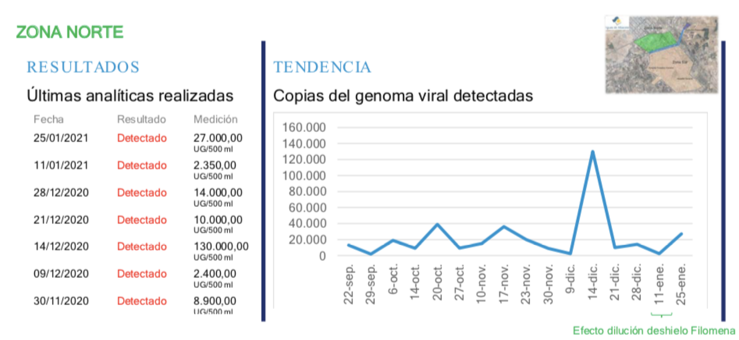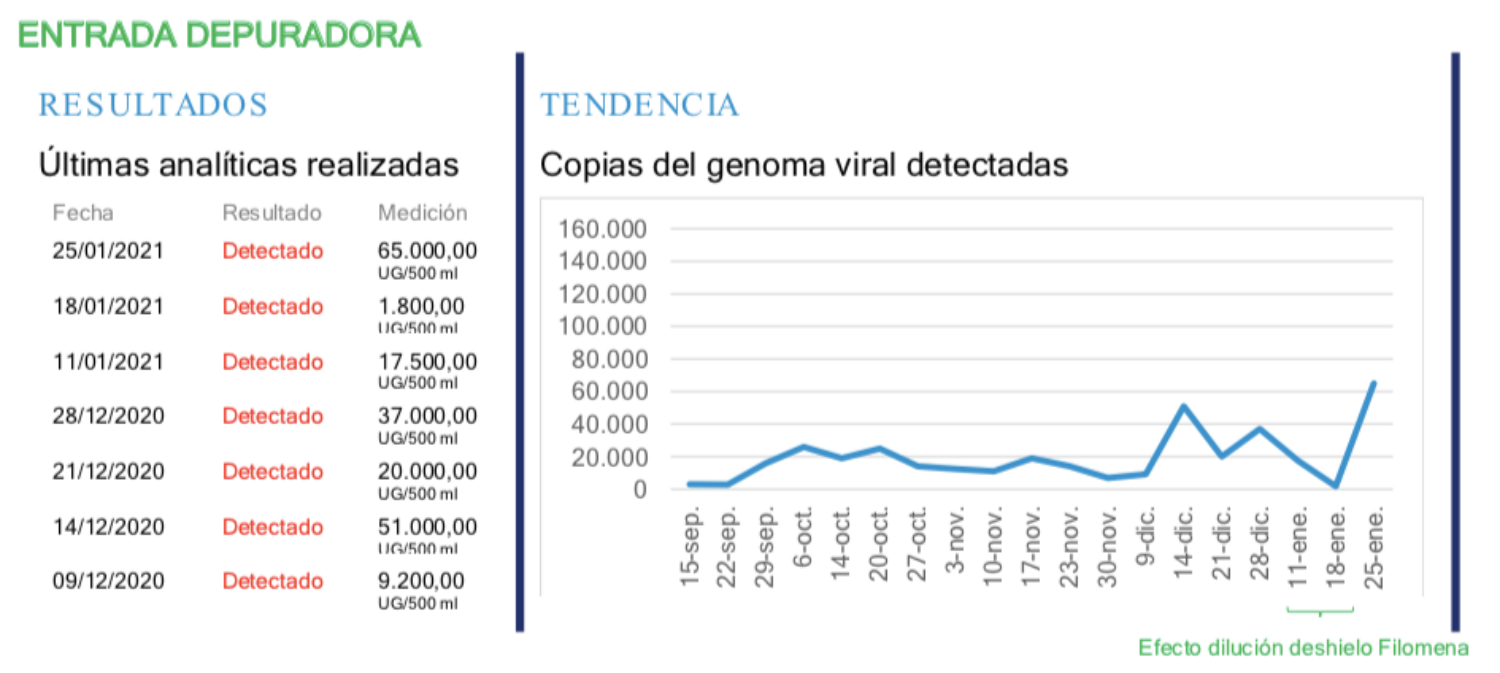 Los datos recogidos el pasado 25 de enero reflejaban este incremento con 65.000 unidades genómicas por 500 mililitros frente a la medición efectuada el pasado 28 de diciembre donde esta cifra se situaba en 37.000 unidades genómicas por 500 mililitros. Además, este aumento es aún mayor si lo comparamos con los datos que congelaba Filomena en 1.800 unidades genómicas por 500 mililitros durante la medición del 18 de enero. Así, cabe destacar que este dato está relacionado directamente con la presencia del virus en la población y ha ido aumentando considerablemente durante el mes de enero.