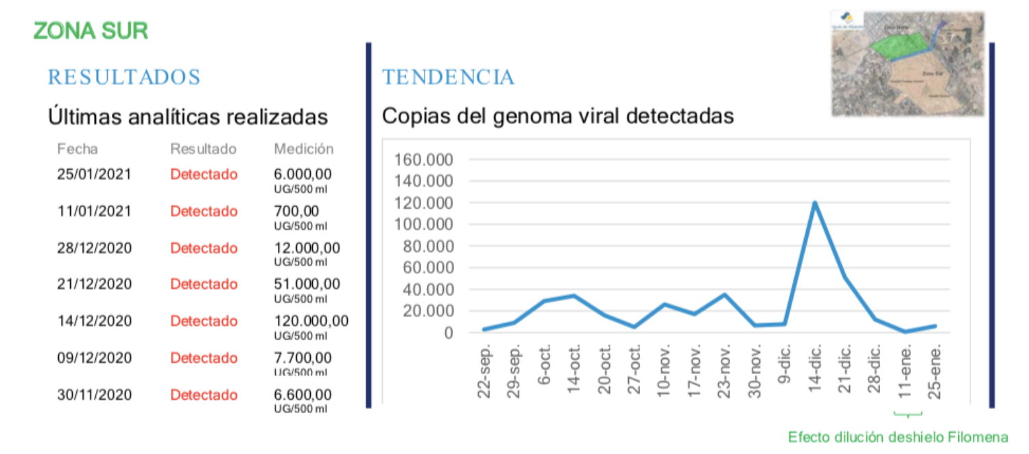 Tras los últimos análisis realizados en Albacete, se puede apreciar, en líneas generales, un notable ascenso en la tendencia si los comparamos con los datos obtenidos en la semana de 28 de diciembre, tras observarse que en las semanas del 11 y el 18 de enero se obtuvieron resultados con concentraciones de virus menores, posiblemente por la dilución del deshielo y el temporal Filomena.