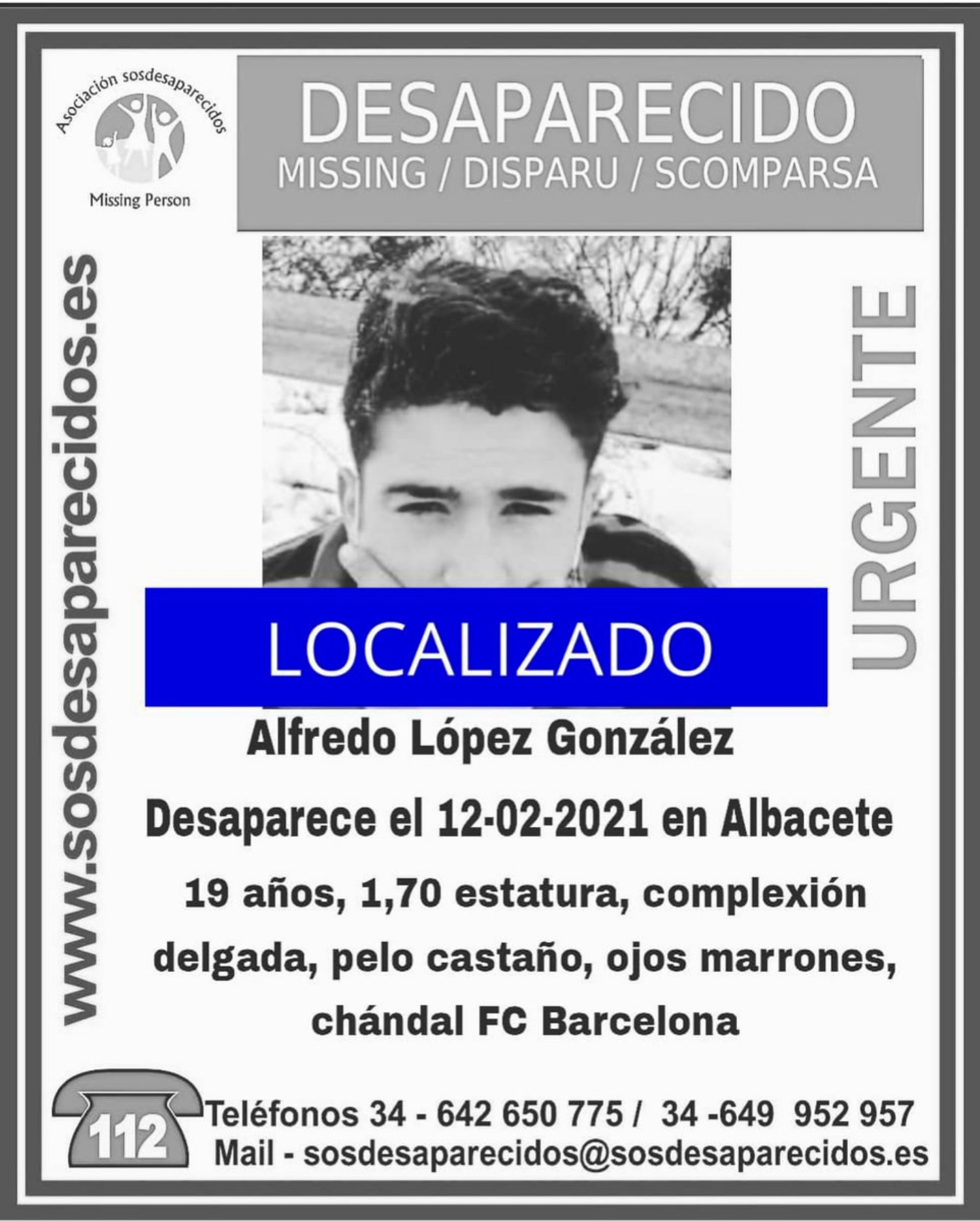 La Asociación SOS Desaparecidos difundía la noticia de la desaparición de Alfredo, de tan solo 19 años, de quien nada se sabía desde el pasado 12 de febrero.