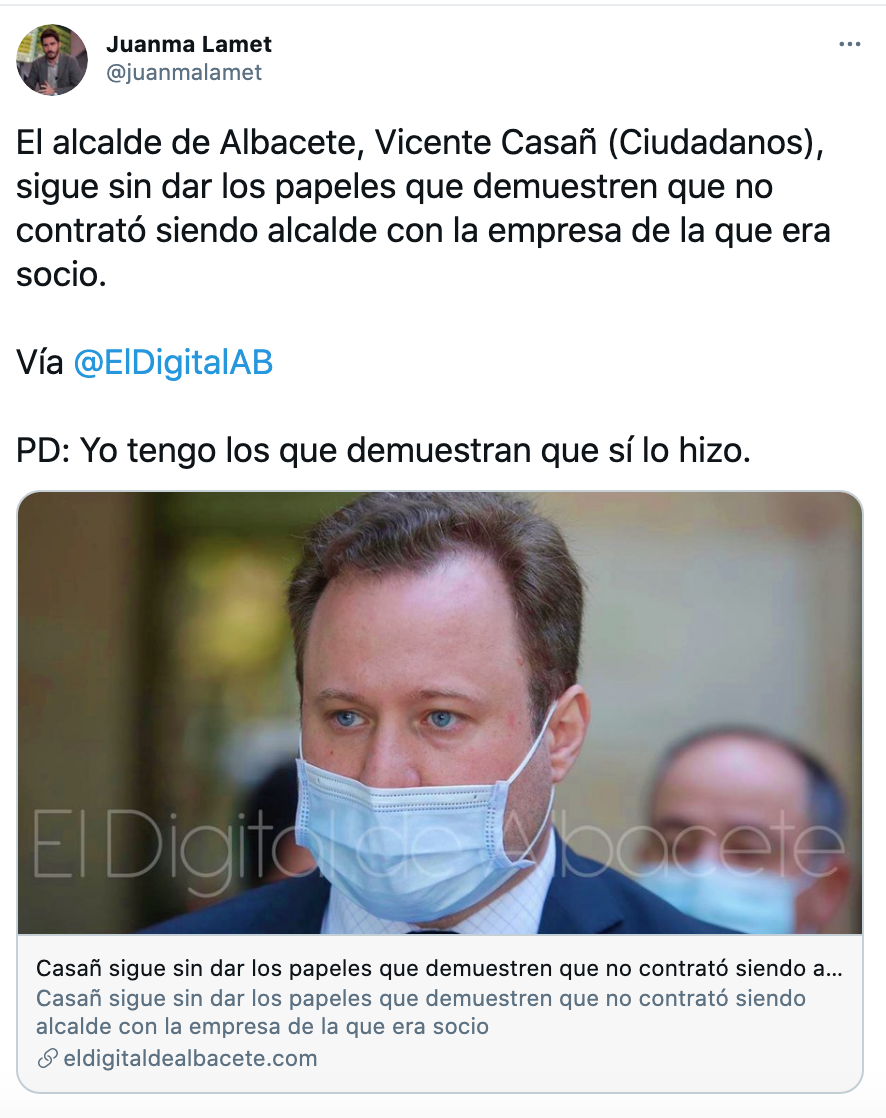 Así, en un mensaje en la cuenta de twitter, Lamet hace referencia a la noticia en la que El Digital de Albacete informaba que Casañ, a día de hoy, sigue sin facilitar al PP la documentación requerida a raíz de la publicación de El Mundo en la que se señalaba que el primer edil de Albacete habría contratado con su propia empresa varias campañas de publicidad en el periodo inicial de su mandato.
