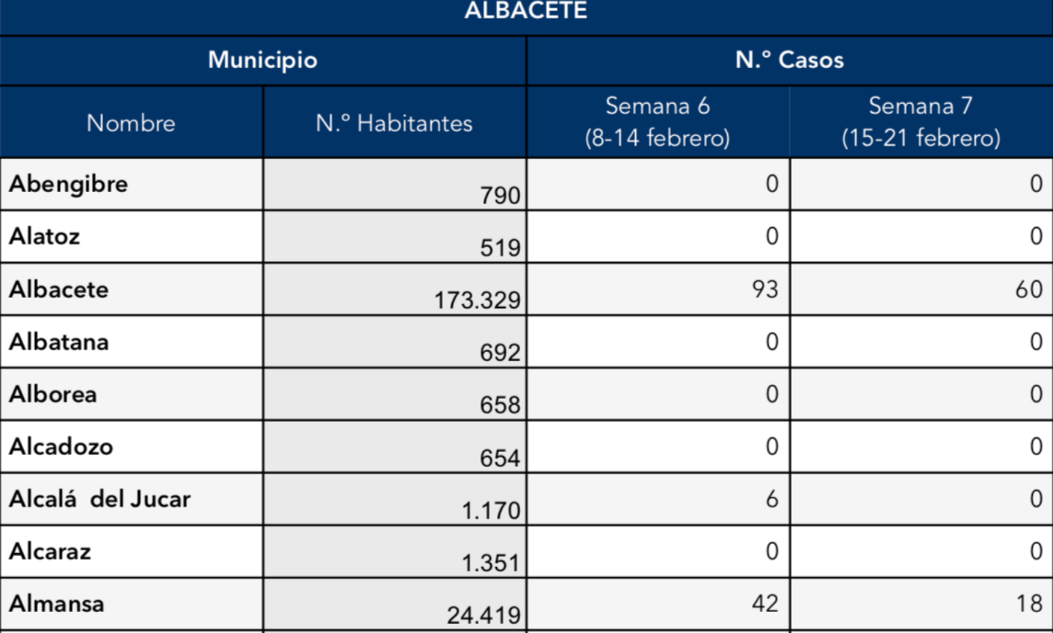 La Consejería de Sanidad de Castilla-La Mancha ofrece desde el 3 de septiembre, la información relacionada con la evolución del COVID-19 en los municipios de la provincia de Albacete con una población de más de 1.000 habitantes. Además, desde la semana pasada también se ofrecen los datos de incidencia del virus en localidades de 500 habitantes.