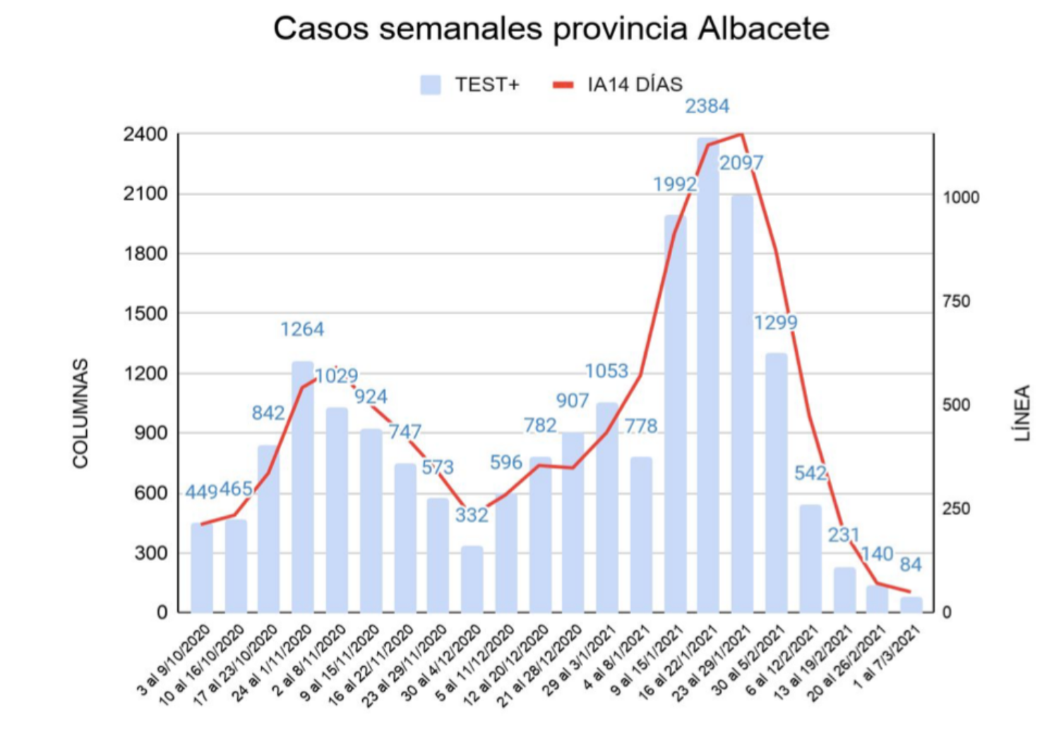 Continúa, por tanto, una marcada mejoría en los parámetros de riesgo que sitúan a la provincia de Albacete en “un nivel de riesgo medio (Alerta 2)”. Sin embargo subrayaban que “es importante seguir de cerca el porcentaje de positividad en Prueba Diagnóstica de Infección Activa (PDIA) como la alerta por un posible cambio de tendencia”.