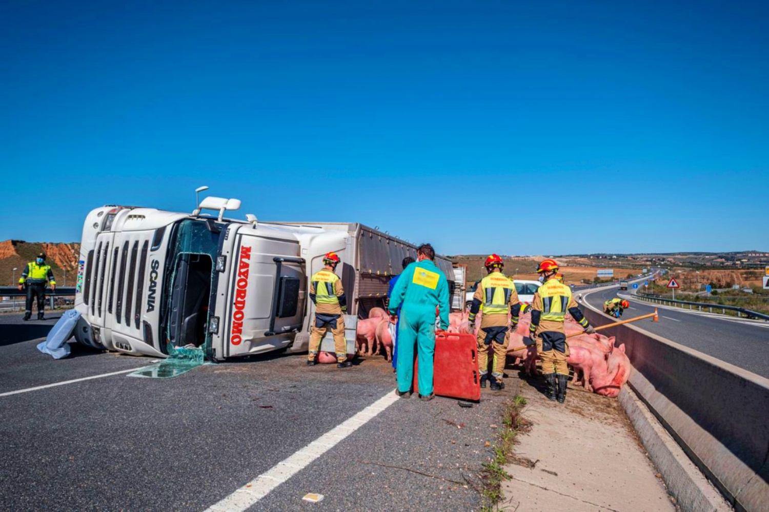 Un hombre de 37 años ha resultado herido tras volcar el camión que conducía y en el que transportaba cerdos, los cuales, debido al accidente, se han escapado por la carretera autonómica CM-40, dentro del término municipal de Toledo, por lo que se ha procedido a cortar la vía.