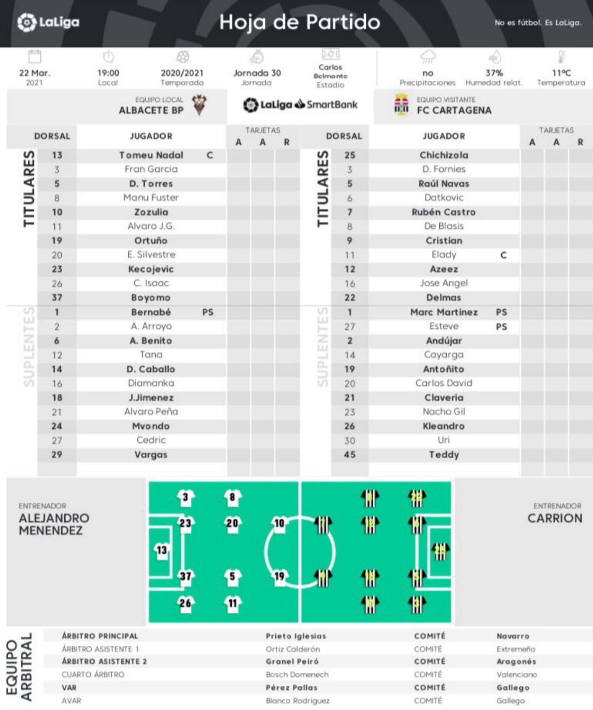 No hubo cambios durante el tiempo de asueto en ninguno de los dos equipos y tanto Albacete como Cartagena salieron de la caseta con la clara intención de ser muy intensos durante la primera mitad, en defensa los blancos y en ataque los blanquinegros; hoy vestidos de rojo.