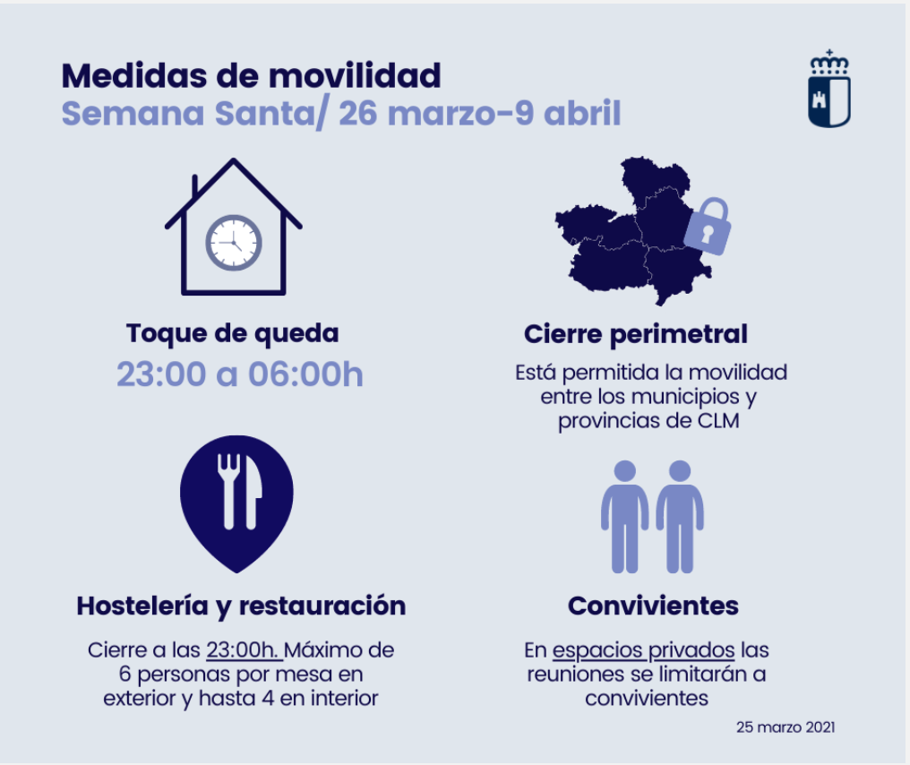 De este modo el Gobierno de Castilla-La Mancha reducirá el toque de queda de la medianoche a las 23:00 horas. Se trata de nuevas restricciones horarias que se aplicarán de cara a los días de Semana Santa y que permitirán la apertura de los establecimientos de hostelería también hasta las 23:00 horas.