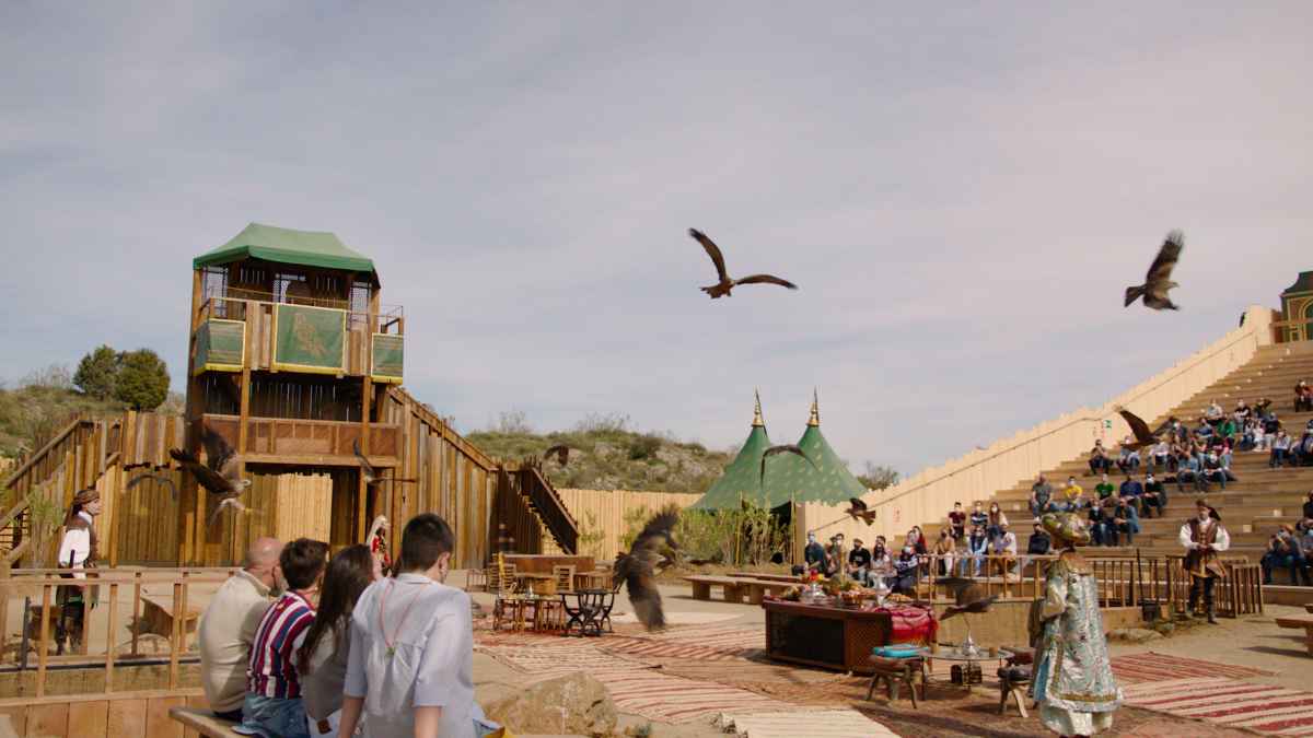 La historia se desarrolla en el campamento califal y las aves tienen todo el protagonismo y, además de llenar el cielo con todos los ejemplares en la parte final, incluso bailan al son de la música y bajo las órdenes de la Academia de Cetrería de Puy du Fou España.