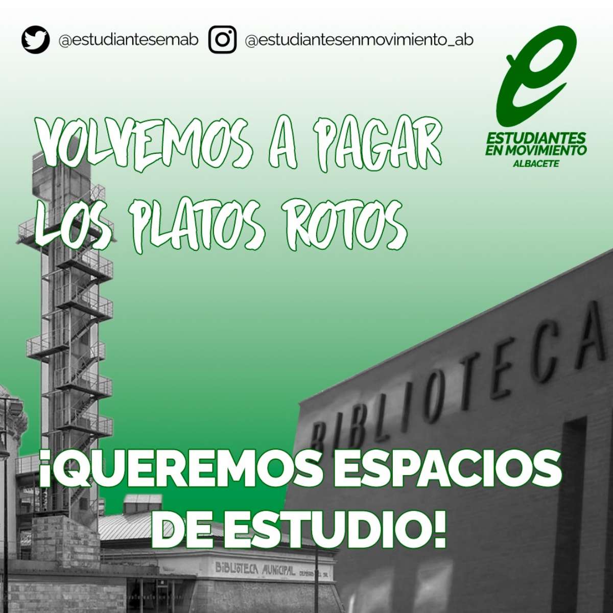 Desde Estudiantes en Movimiento Albacete denunciaban a través de un comunicado que que “los estudiantes de la ciudad estamos volviendo a pagar los platos rotos de la mala gestión de la pandemia por parte del Ayuntamiento y de la Junta de Comunidades de Castilla-La Mancha». Exponían que “llega la temporada de exámenes y las bibliotecas y demás espacios de estudio se encuentran colapsados ante el aumento de estudiantes que asisten y el insuficiente aforo”.