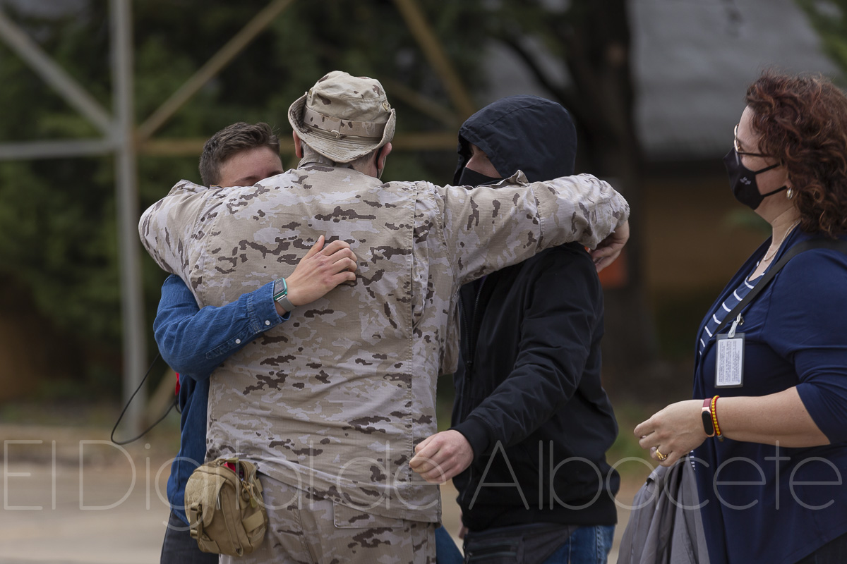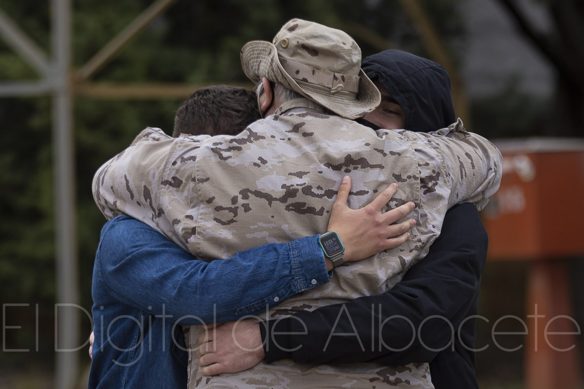 La lluvia era protagonista en esta despedida, pero también los abrazos contenidos a causa de la pandemia y las lágrimas de emoción de los familiares que se acercaban hasta la Base Aérea de Albacete. Se mostraban orgullosos por la misión que llevarán acabo los efectivos desplegados en Lituania pero ya cuentan los días para volver a ver a sus familiares de nuevo en tierras albaceteñas.