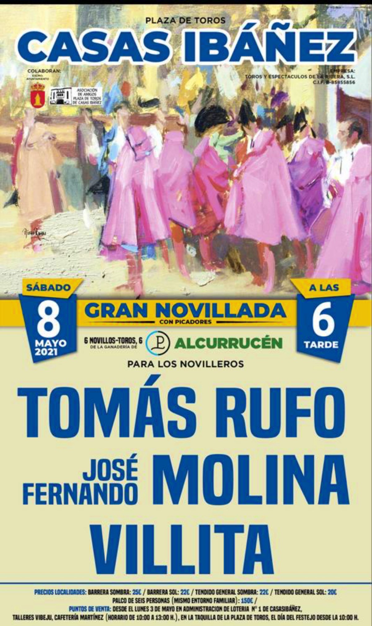 El próximo 8 de Mayo, a las 18:00 horas, tendrá lugar en la plaza de toros de Casas Ibañez una gran novillada con picadores.