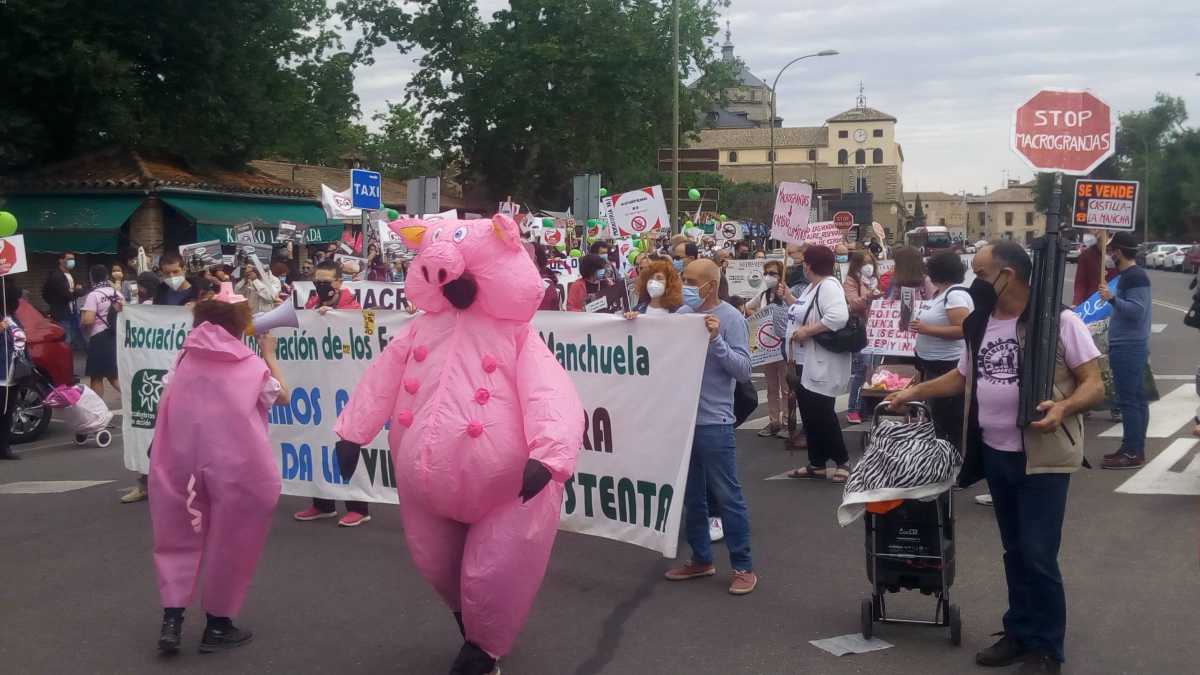 Unas 300 personas, según fuentes de la Policía Local, se han manifestado este domingo en Toledo convocadas por la plataforma Stop Macrogranjas en Castilla-La Mancha con el objetivo de exigir al Gobierno regional que apruebe una moratoria a los proyectos de ganadería industrial.