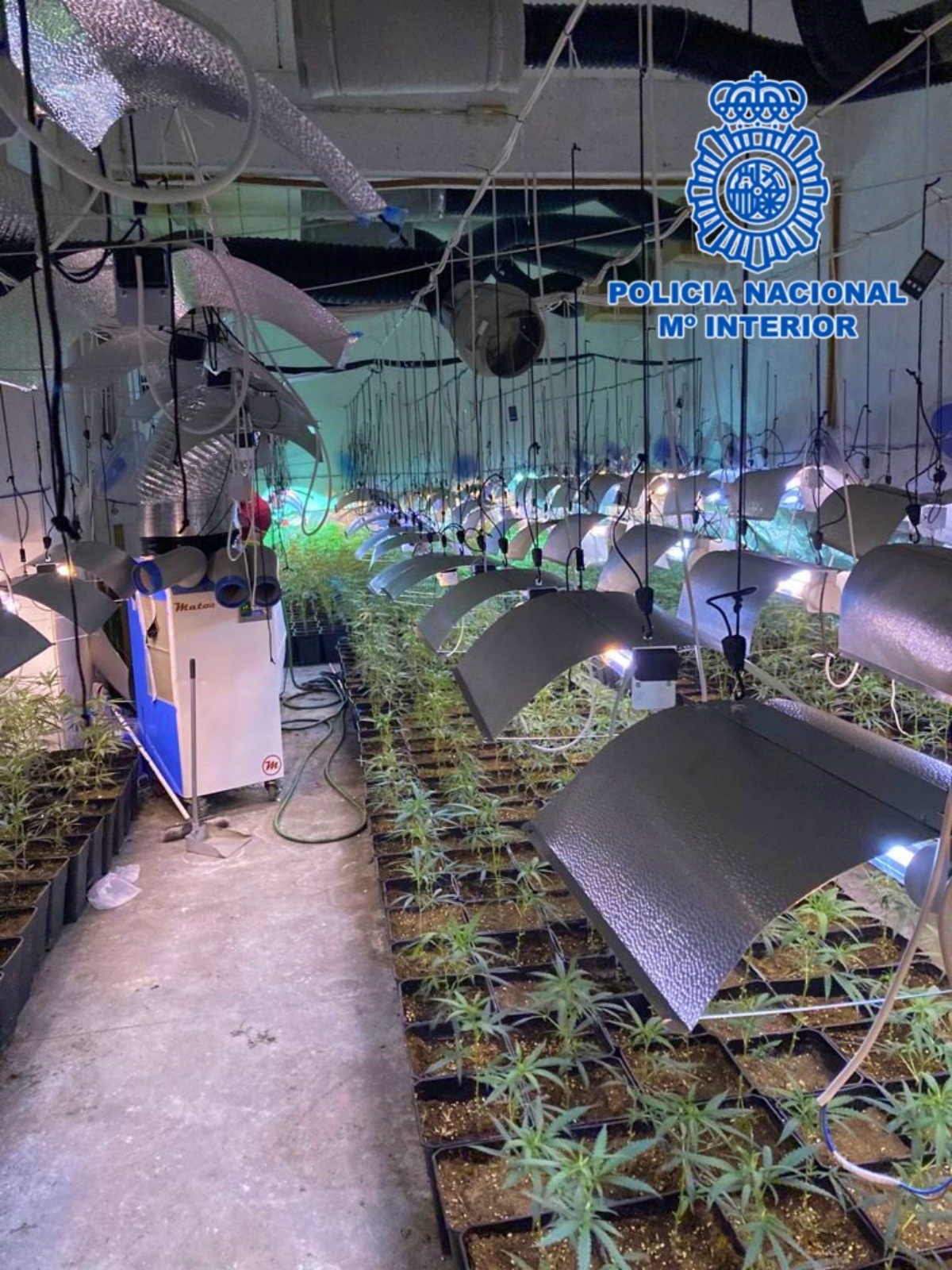 La plantación se encontraba en una nave industrial, oculta tras unos muros de pladur, que dificultaban su localización, ha informado la Policía Nacional en un comunicado.