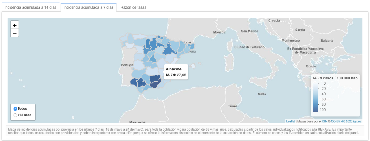 Por tanto, podemos comprobar casi a tiempo real cuál es la situación epidemiológica de cada una de las provincias de nuestro país. Así, a día 26 de mayo, la provincia de Albacete presentaba una incidencia acumulada a 14 días de 75,23 nuevos contagios por cada 100.000 habitantes.