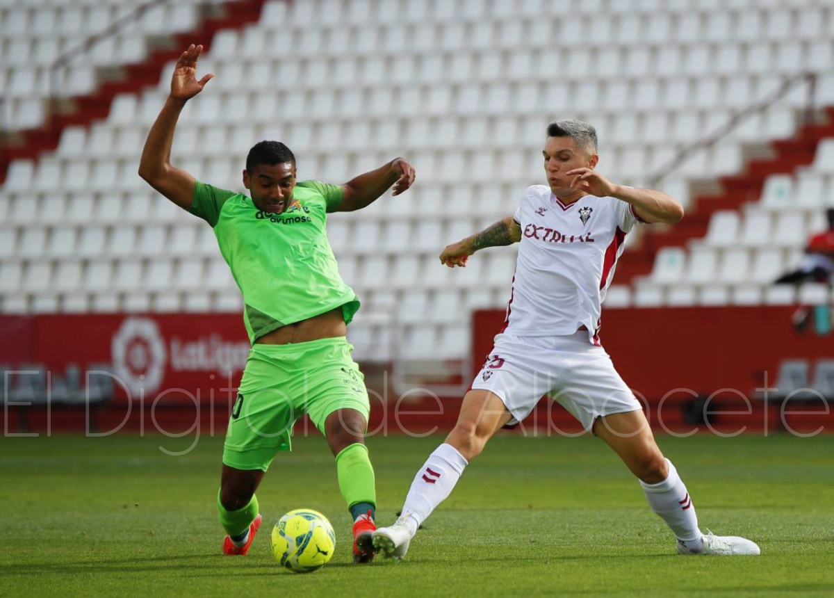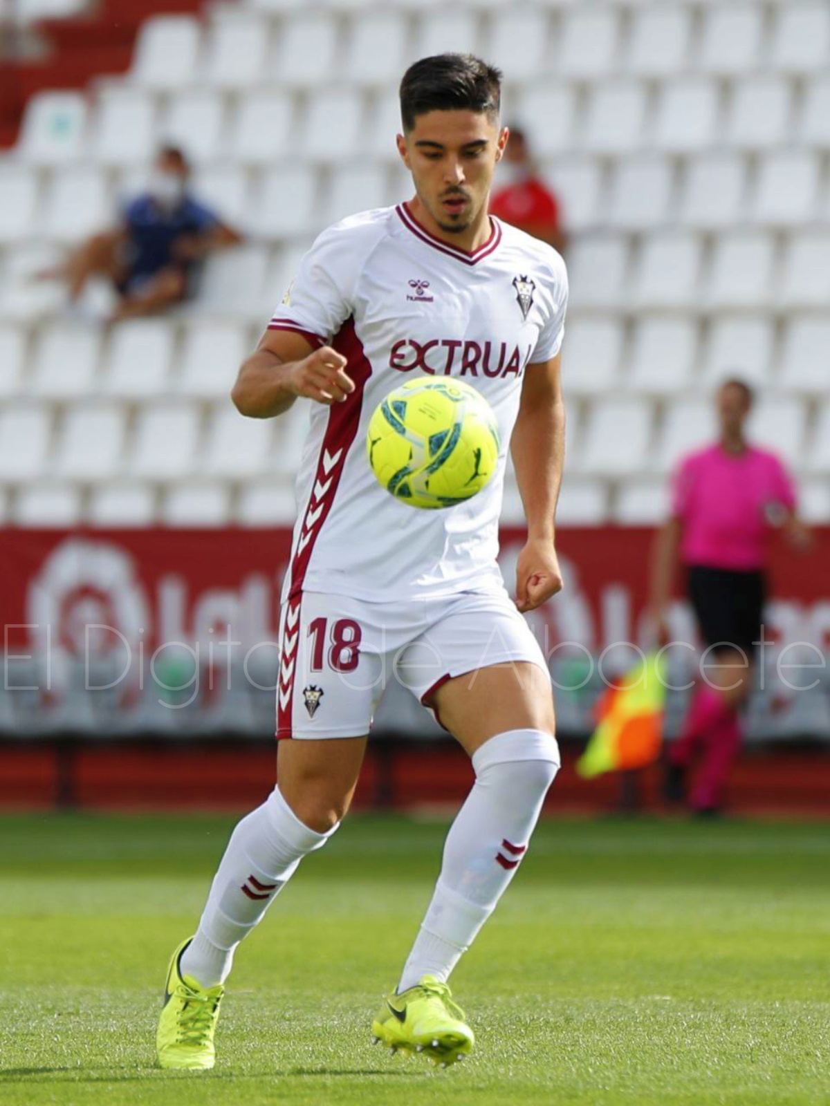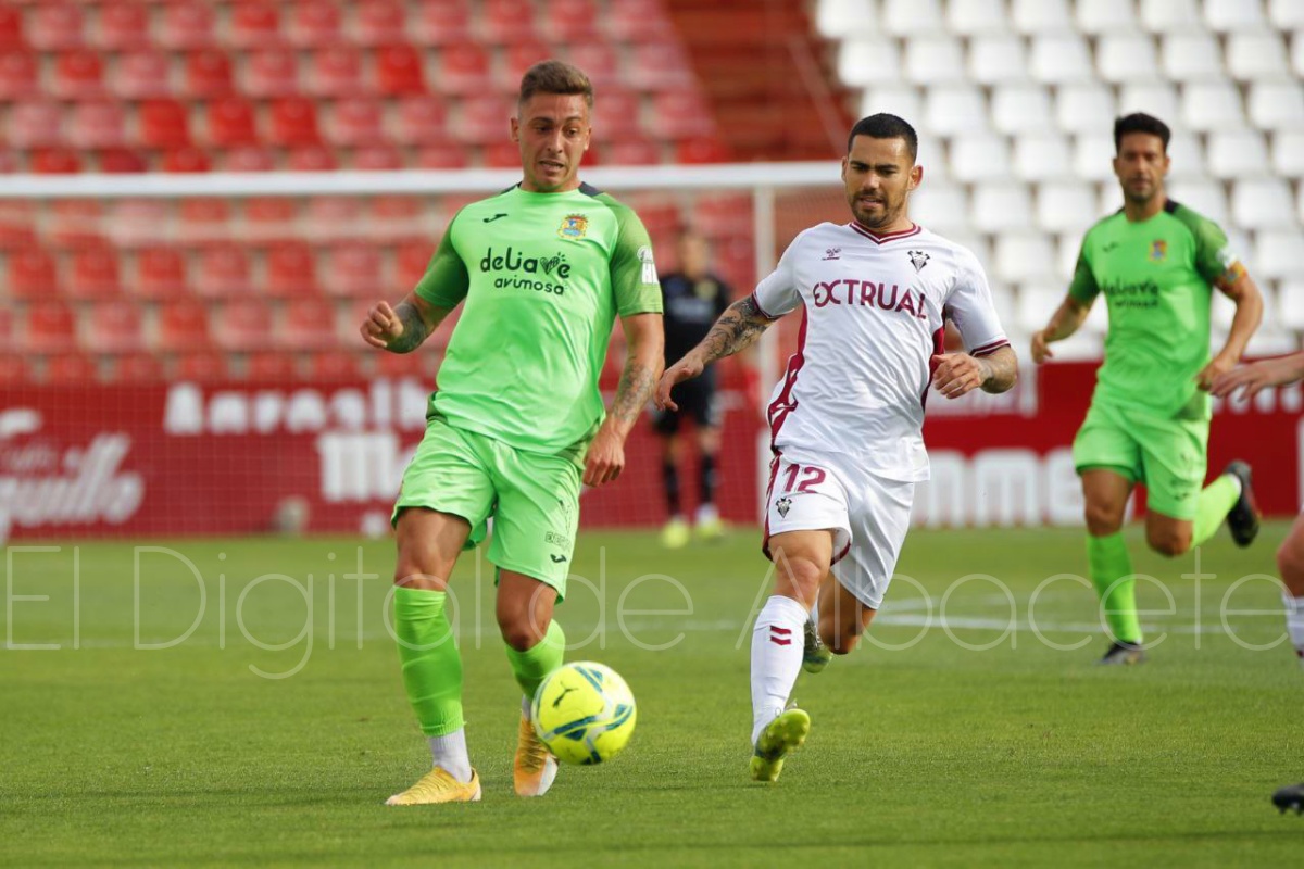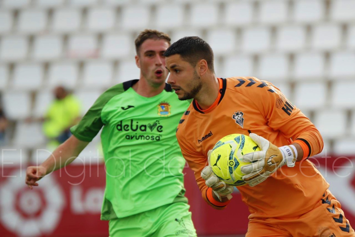 Estaban pasando tan pocas cosas sobre el terreno de juego que lo único que pasaba era el tiempo, mostrándose ambos guardametas prácticamente inéditos todavía cuando el partido encaraba el final de la primera mitad. En lo que a la defensa blanca se refiere, la zaga se estaba mostrando segura y no había cometido errores, recibiendo constantes ayudas de un centro del campo que se prodigaba mejor en destruir que en crear y que no estaba surtiendo de balones en condiciones a los encargados del gol; arriba, Manu Fuster se mostraba en su línea, desaparecido, y Emiliano Gómez, como decíamos, era el jugador que más estaba poniendo de su parte para que fuera el 1 y no el 0 el guarismo en el casillero albacestista del marcador electrónico del Carlos Belmonte.