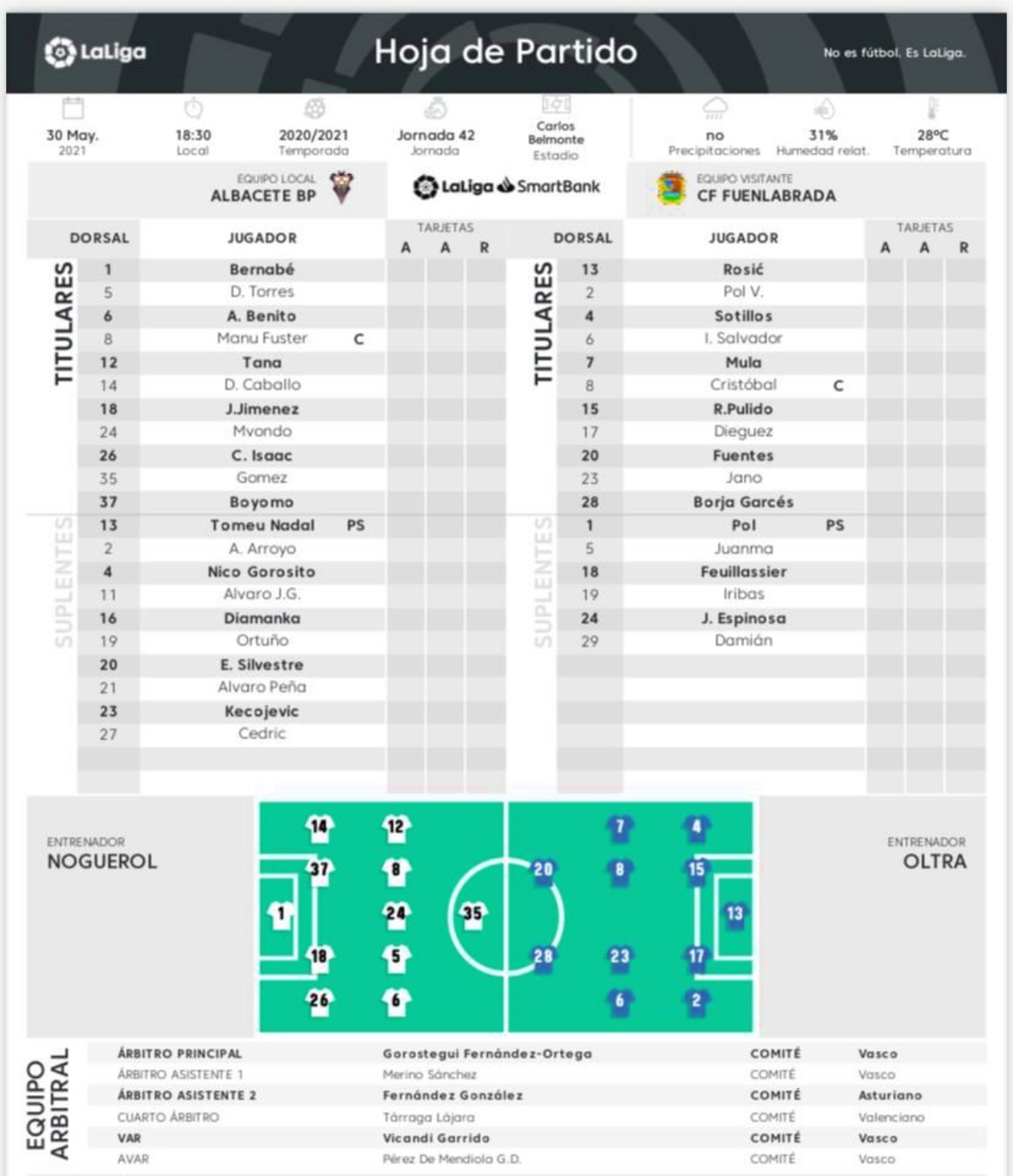 Con el descenso matemático ya en el bolsillo y con nada más en juego que no seguir arrastrando el escudo del Albacete Balompié, la plantilla blanca afrontaba el último partido de esta nefasta temporada y lo hacían midiéndose a un Fuenlabrada que tampoco se jugaba nada y que a diferencia del Alba, sí que seguirá la próxima temporada en el fútbol profesional.