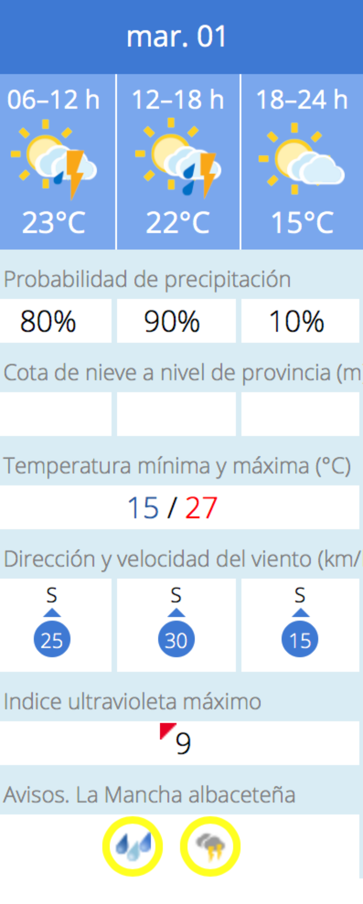 - En lo que a Albacete y su provincia se refiere, y según las previsiones de la Aemet, entre las 10.00 y las 18.00 horas se podrían producir chubascos de importante intensidad que vendrían acompañados de fuertes rachas de viento. Ambos factores colocan a la capital y a buena parte de la provincia en alerta amarilla por lluvias fuertes y vientos.