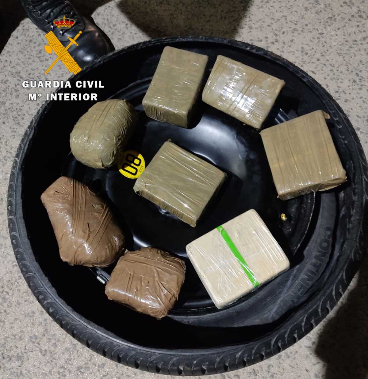 Una vez identificadas estas cuatro personas y cuando se procedía al registro del segundo turismo, uno de los guardias civiles del operativo observó el inusual peso que presentaba la rueda de repuesto, sospechando que pudiera contener en su interior algún tipo de estupefaciente.