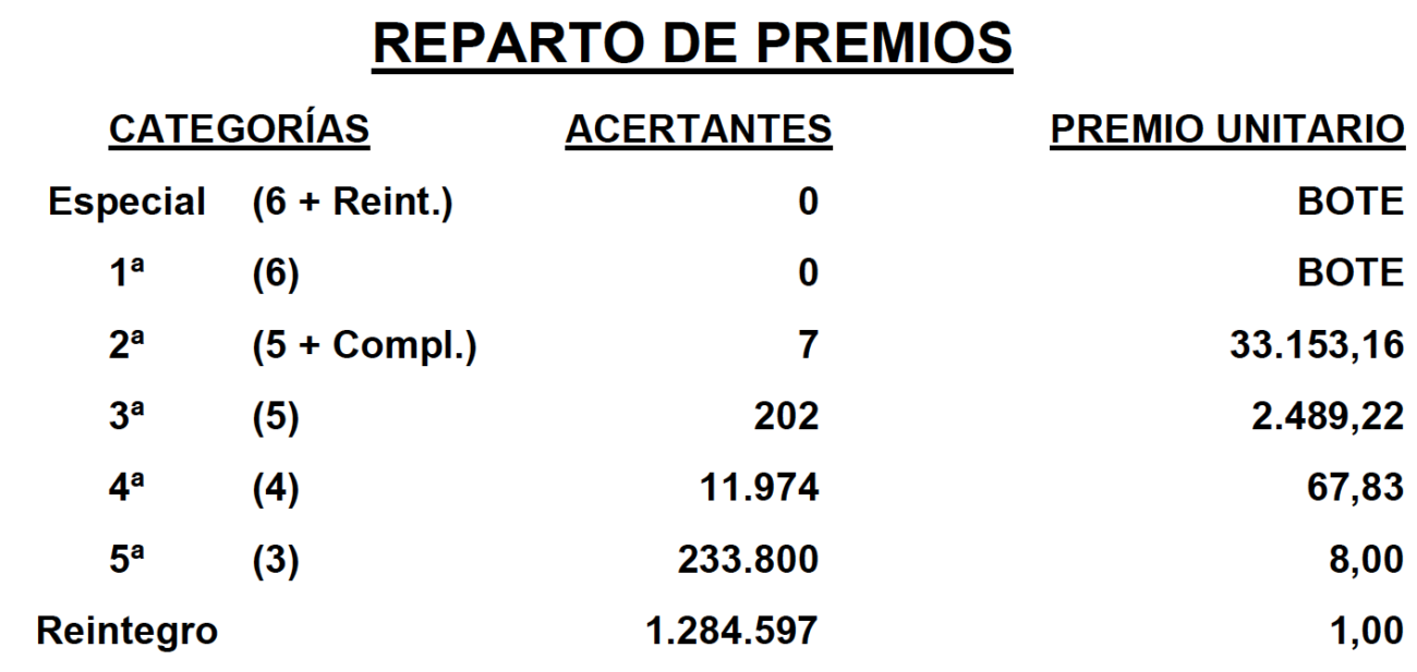 En el sorteo de La Primitiva de hoy no existen boletos acertantes de Categoría Especial (6 aciertos + Reintegro), ni de Primera Categoría (6 aciertos), por tanto, el fondo destinado a ambas Categorías se ofrecer como BOTE en el próximo sorteo de La Primitiva, donde un único acertante de Primera Categoría con Categoría Especial podría ganar 25.000.000,00 de euros.