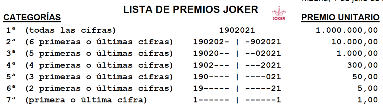 En el sorteo de EL JOKER de hoy existe UN boleto acertante de Primera Categoría con un premio de 1.000.000,00 de euros, que ha sido validado en el Despacho Receptor n 38.330 GUADALAJARA, situado en Cardenal Gonz lez de Mendoza, 29.