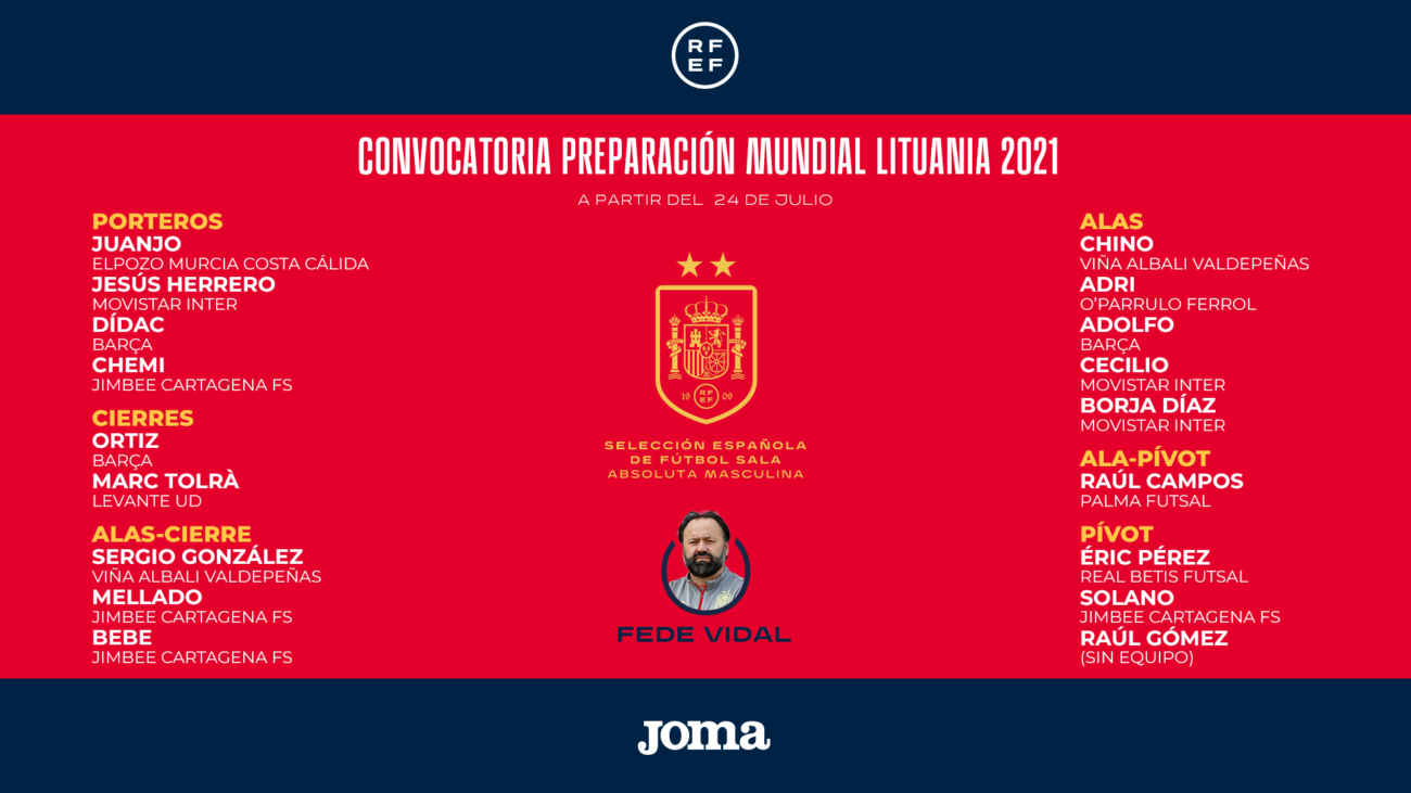 Y también han entrado en la convocatoria los alas Chino (Viña Albali Valdepeñas), Adri (O’Parrulo Ferrol), Adolfo (Barça) y Cecilio y Borja Díaz (Movistar Inter); junto con el ala-pívot, Raúl Campos (Palma Futsal) y los pívots, Raúl Gómez (sin equipo), Solano (Jimbee Cartagena) y Eric Pérez (Real Betis Futsal).
