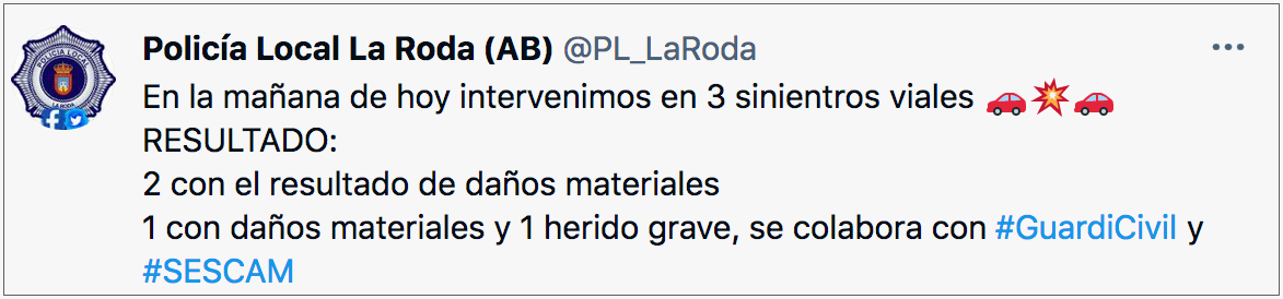 Al respecto de este accidente, la Policía Local de La Roda ha indicado en sus redes sociales que se produjeron daños materiales y que el carácter del herido fue grave.
