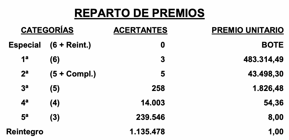 De Primera Categoría (seis aciertos) existen tres boletos acertantes que han sido validados en la Administración de Loterías Número 9 de Ciudad Real, en la Número 3 de L’Eliana (Valencia) y a través del canal oficial de internet de Loterías y Apuestas del Estado. Cada uno de ellos cobrará 483.314,49 euros.