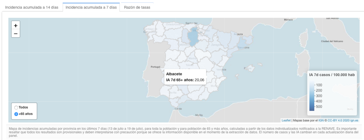 Por tanto, podemos comprobar casi a tiempo real cuál es la situación epidemiológica de cada una de las provincias de nuestro país. Así, a día 20 de julio, la provincia de Albacete presentaba una incidencia acumulada a 14 días de 234,69 nuevos contagios por cada 100.000 habitantes.