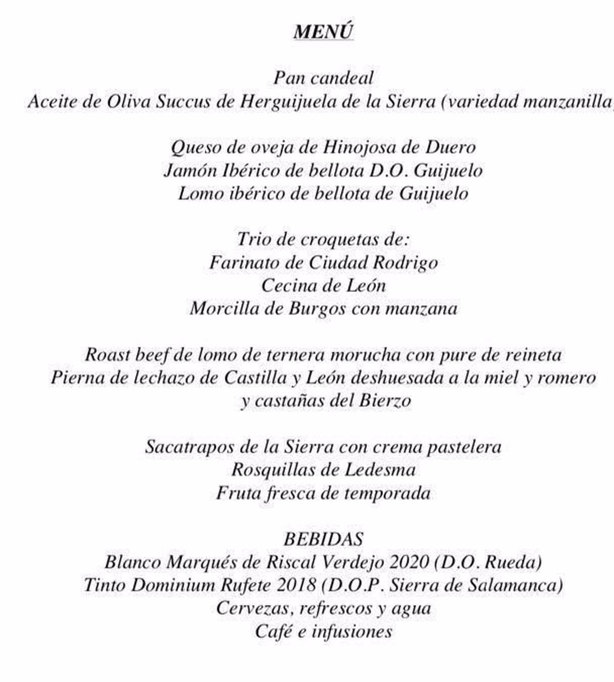 Los presidentes autonómicos y los miembros del Gobierno que asisten este viernes a la Conferencia de Presidentes en el Convento de San Gil de Salamanca disfrutarán en el transcurso de la cita de un menú compuesto por producto de Castilla y León, comenzando con pan candeal y aceite de oliva de Herguijuela de la Sierra como entrante, preludio de un trío de croquetas –de farinato de Ciudad Rodrigo, de cecina de León y de morcilla de Burgos–.
