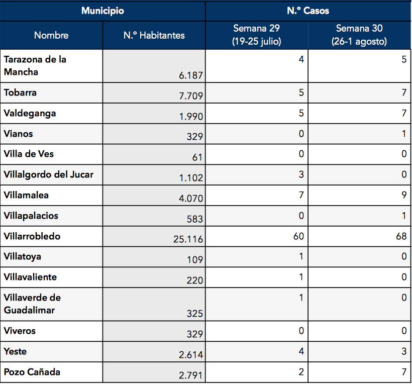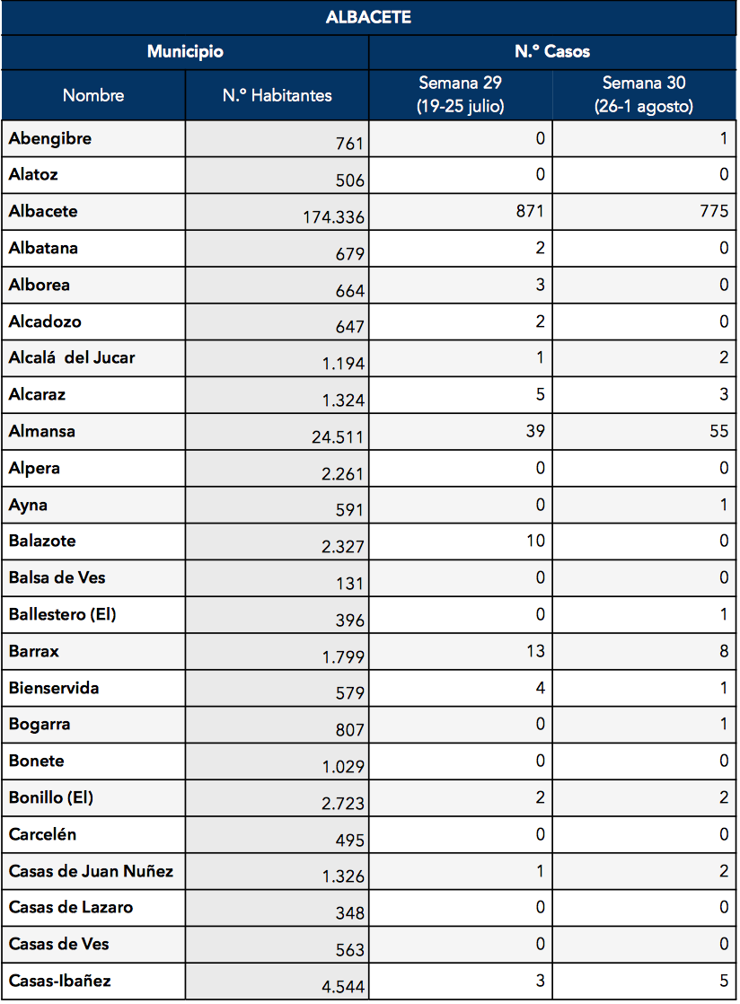 La Consejería de Sanidad de Castilla-La Mancha ofrece desde septiembre de 2020 la información relacionada con la evolución del COVID-19 en los municipios de la provincia de Albacete.