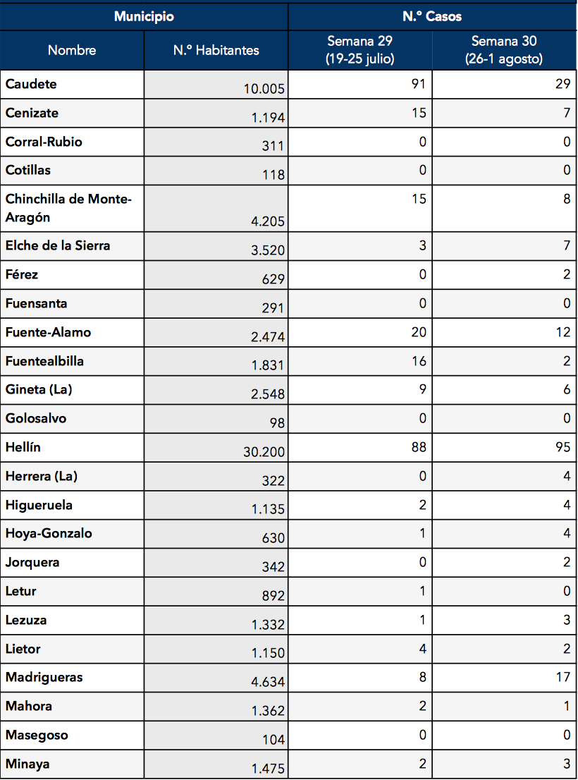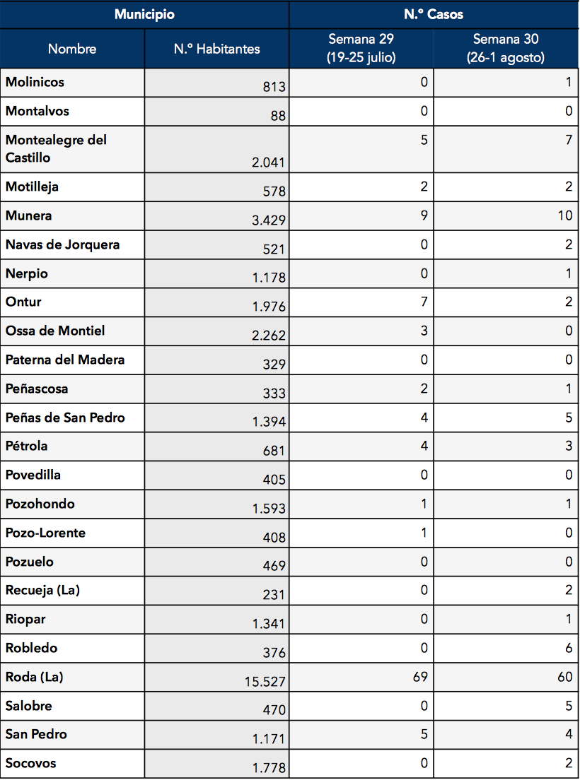 Entre los municipios de la provincia de Albacete sin rastro de COVID-19 encontramos: Alatoz, Alpera, Balsa de Ves, Bonete, Carcelén, Casas de Lázaro, Casas de Ves, Corral Rubio, Cotillas, Fuensanta, Golosalvo, Masegoso, Montalvos, Paterna del Madera, Povedilla, Pozuelo, Villa de Ves y Viveros (todos llevan las últimas dos semanas sin casos nuevos de coronavirus); Albatana, Alborea, Alcadozo, Balazote, Letur, Ossa de Montiel, Pozo Lorente, Villalgordo del Júcar, Villatoya, Villavaliente y Villaverde de Guadalimar no contabilizan casos de covid-19 en la semana del 26 de julio al 1 de agosto.