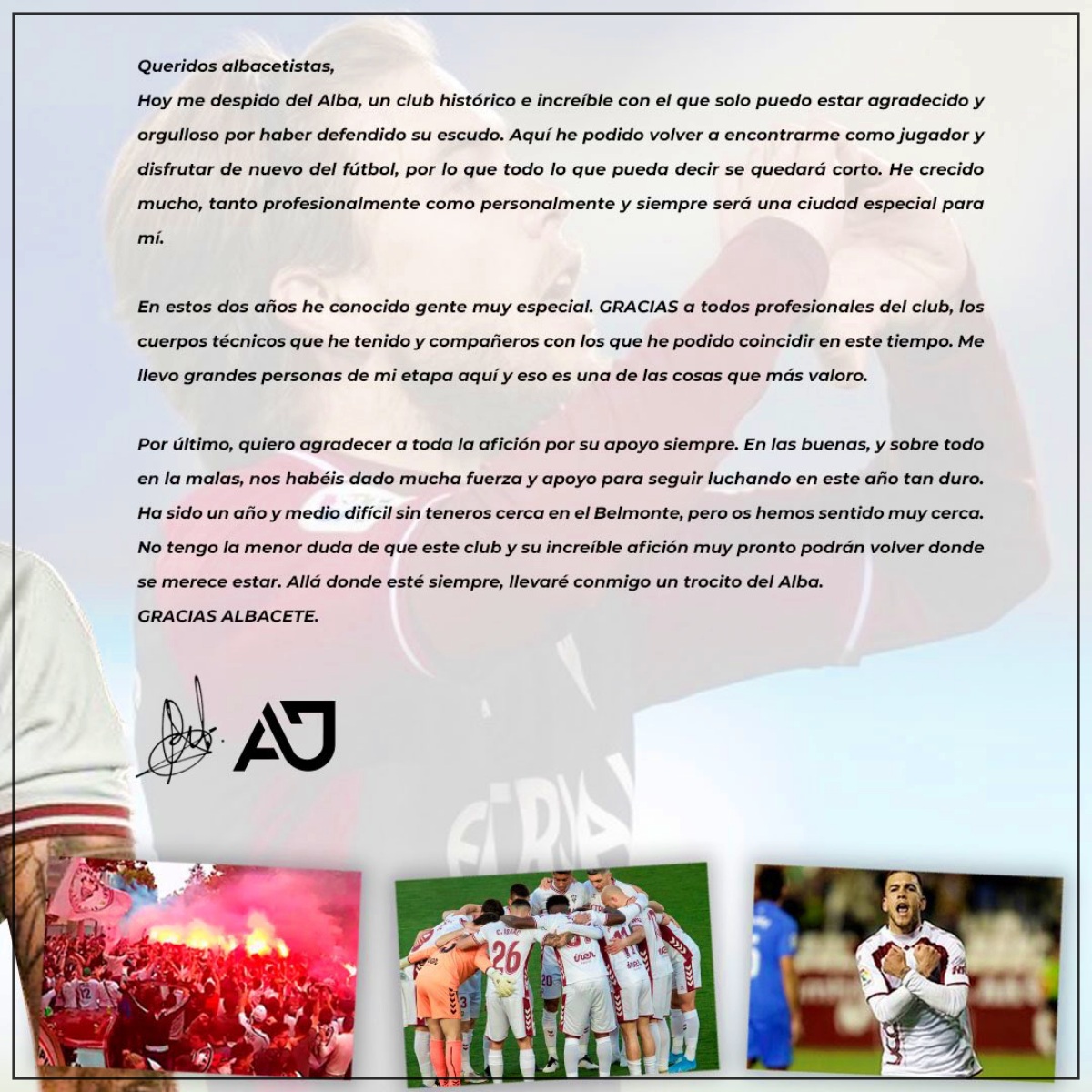 El ya ex jugador del Alba y nuevo jugador del Cádiz ha publicado en sus redes sociales una carta con la que se despide del Albacete Balompié y de su afición.