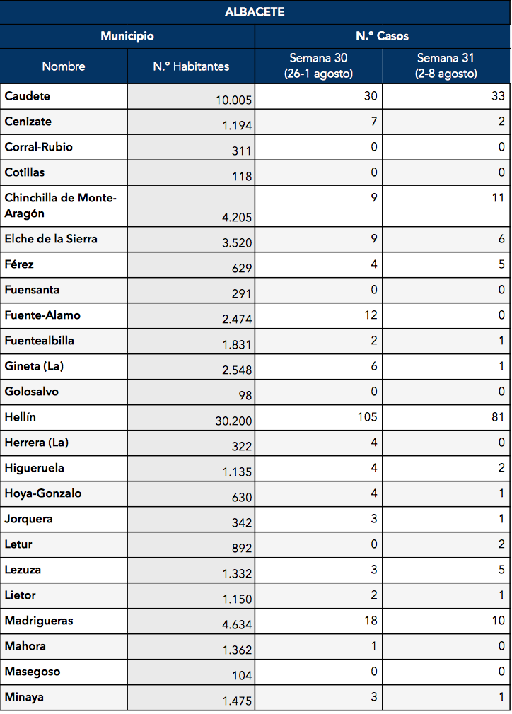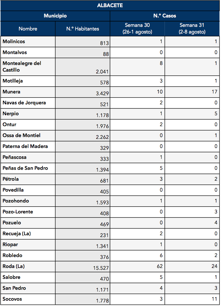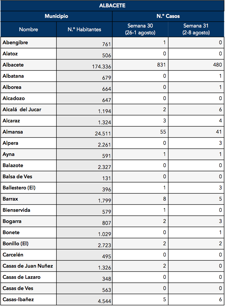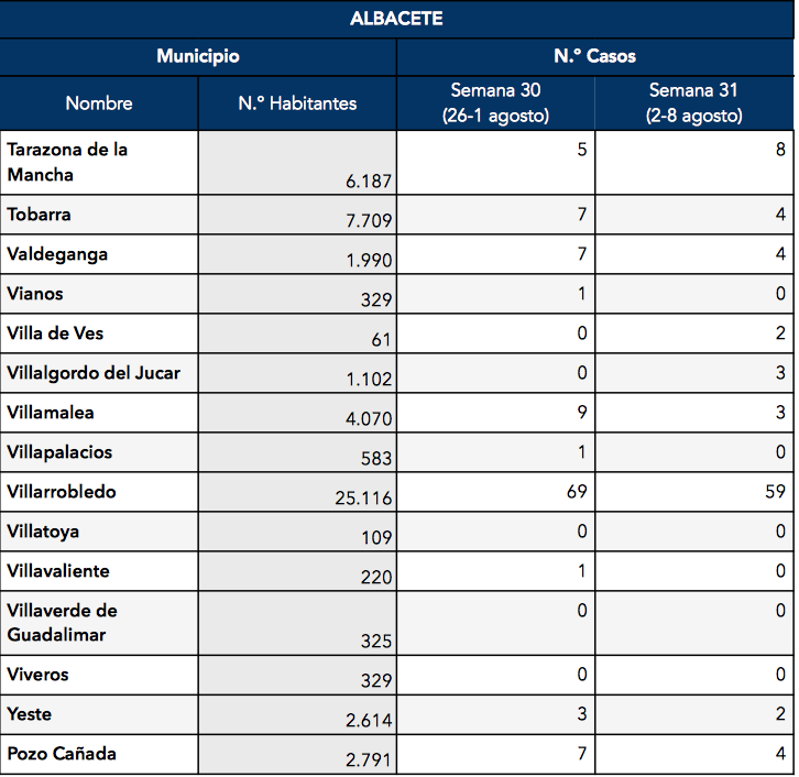 Entre los municipios de la provincia de Albacete sin rastro de COVID-19 durante la semana del 2 al 8 de agosto encontramos: Abengibre, Alatoz, Alcadozo, Balazote, Balsa de Ves, Bienservida, Carcelén, Casas de Juan Núñez, Casa de Lázaro, Casas de Ves, Corral Rubio, Cotillas, Fuensanta, Fuente-Alamo, Golosalvo, La Herrera, Mahora, Masegoso, Montalvos, Navas de Jorquera, Ontur, Paterna del Madera, Peñascosa, Peñas de San Pedro, Povedilla, La Recueja, Riópar, Vianos, Villapalacios, Villatoya, Villavaliente, Villaverde de Guadalimar y Viveros.