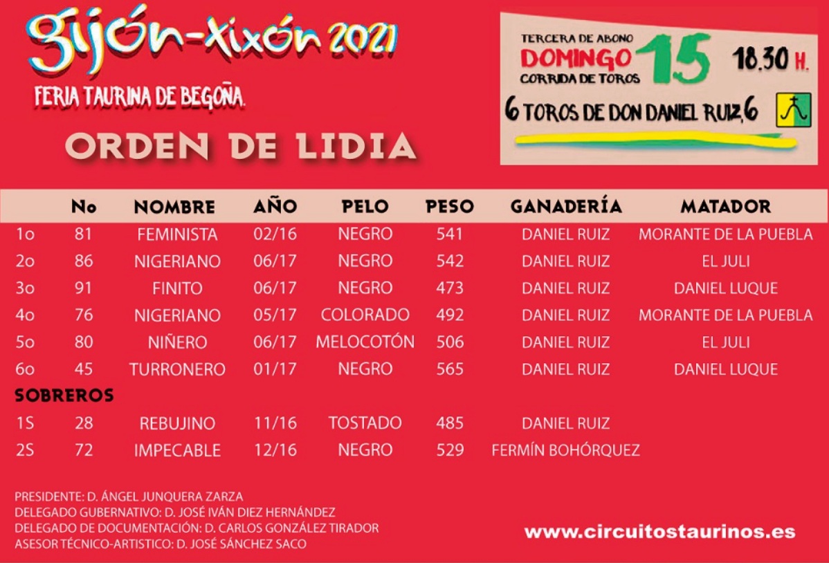 «Feminista» y «Nigeriano» se llamaban los dos toros de la ganadería de Daniel Ruiz que lidió Morante de la Puebla el pasado domingo, 15 de agosto, en Gijón, nombres que han generado polémica en redes sociales y que han despertado quejas por parte de asociaciones feministas y animalistas.