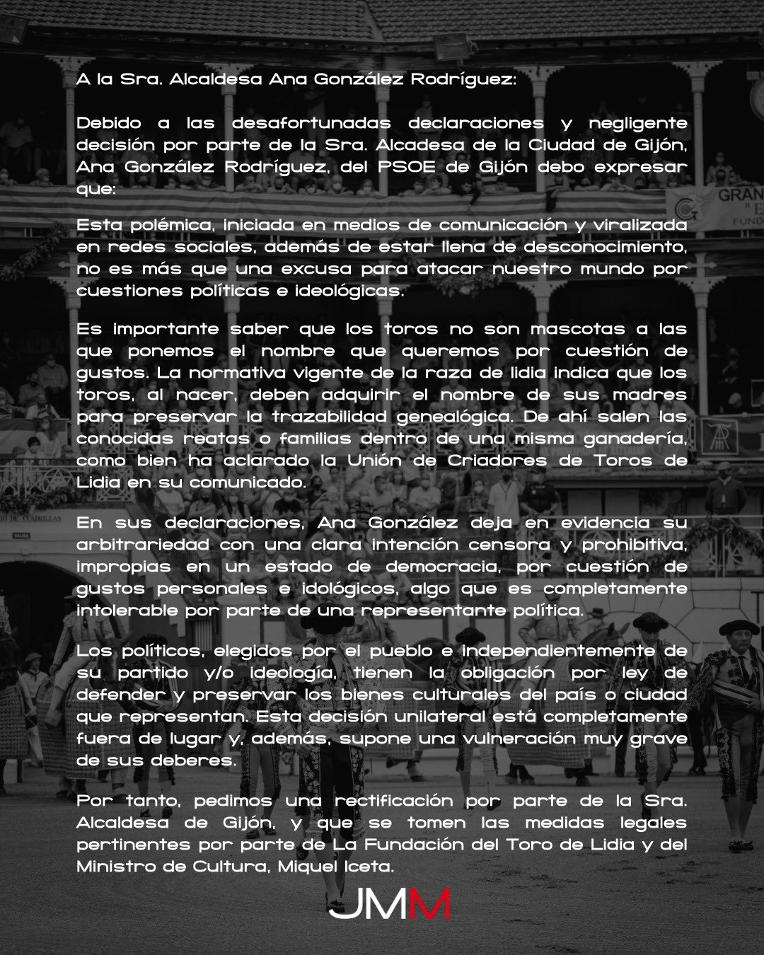 Pero ha sido Jose María Manzanares el que ha querido ir un paso más allá y el diestro alicantino de madre hellinera y figura del toreo ha pedido incluso que el Ministro de Cultura se pronuncie y “tome las medidas legales pertinentes” tras la decisión de la alcaldesa de Gijón de prohibir las corridas de toros en el coso de la localidad asturiana.