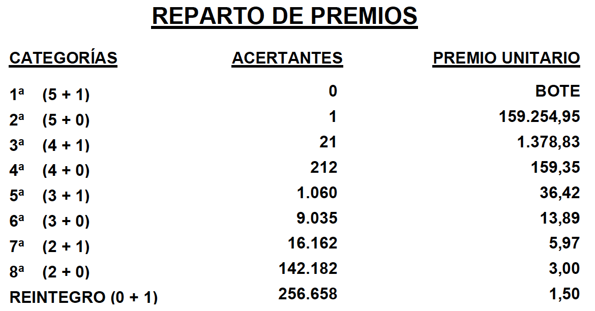 De Primera Categoría (5+1) no existen boletos acertantes por lo que con el BOTE generado, que se pondrá en juego en el sorteo de El Gordo de la Primitiva del próximo domingo, un único acertante podría ganar 5.400.000,00 euros.