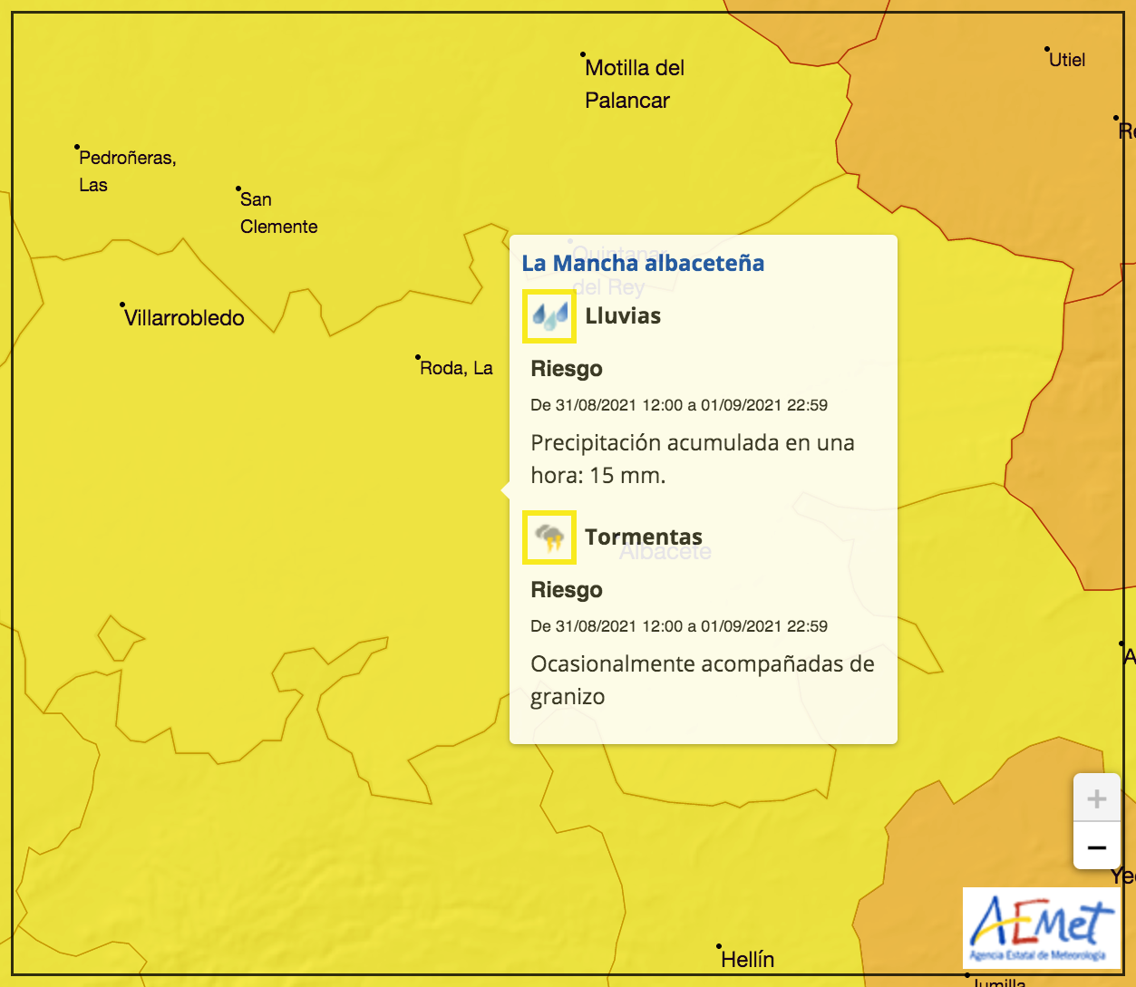 La entrada de una DANA por el oeste de la Península, junto con la presencia de aire muy húmedo en el entorno, además del calentamiento diurno de la superficie propio de estas fechas, favorecerán la formación de chubascos de carácter tormentoso, que estarán en muchos casos acompañados de rachas fuertes de viento y granizo, en Albacete y amplias zonas de la Península; especialmente en la zona centro de España e interior de la mitad norte peninsular. Dicha inestabilidad se extenderá también a Baleares en la jornada del jueves, y no remitiendo la inestabilidad del todo hasta el domingo.