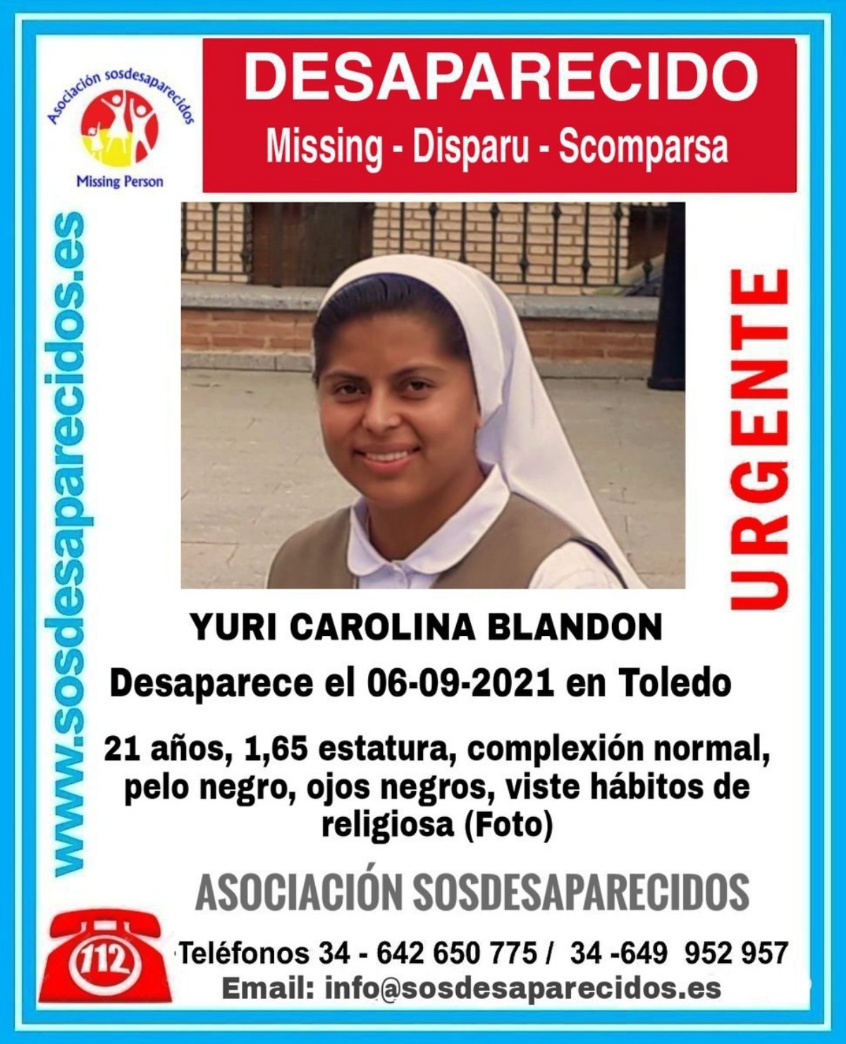 Solicitan la colaboración ciudadana para tratar de dar cuanto antes con el paradero de Yuri Carolina. Así, quien pueda tener cualquier dato fiable sobre esta religiosa se puede poner en contacto con las Fuerzas y Cuerpos de Seguridad del Estado o con los teléfonos que aparecen en el cartel de su desaparición.