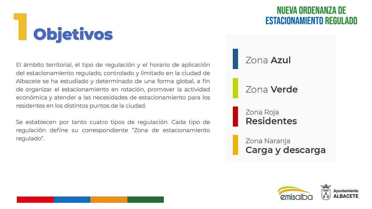 Con la nueva Ordenanza se establecen diferentes tipos de regulación, además de la Zona Azul y Zona de Residentes o Roja; como son la Zona Verde y Zona de Carga y Descarga o Naranja.