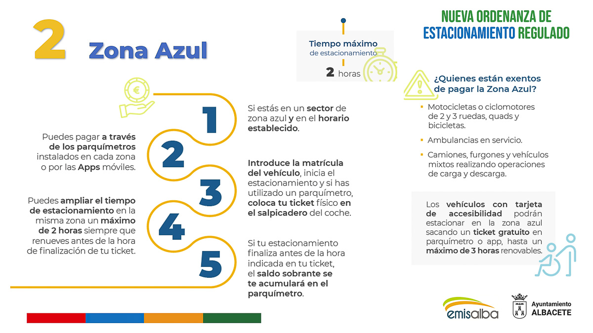 Actualmente, la Zona Azul es la que está más extendida, siendo el tiempo máximo de estacionamiento de dos horas. Como novedad, los vehículos con tarjeta de discapacidad podrán estacionar sacando un ticket gratuito de tres horas renovable. Si los ciudadanos o ciudadanas finalizan el aparcamiento antes de la hora prevista, podrán acumular el importe restante en la función monedero asignada a su matrícula, del mismo modo que se hace en las aplicaciones virtuales.