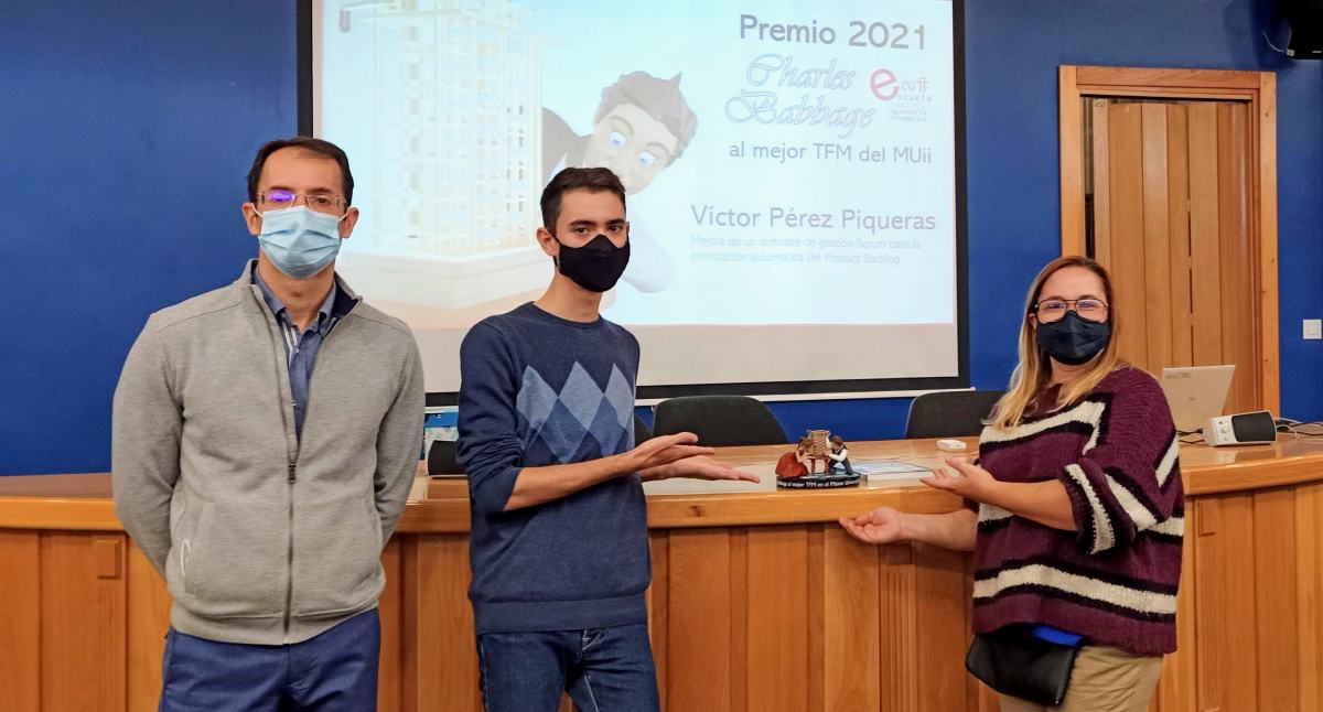 El segundo de los premiados ha sido Víctor Pérez Piqueras, ganador del Premio ESII Charles Babbage, con transferencia empresarial, por su Trabajo Fin de Máster: “Mejora de un software de gestión Scrum para la priorización automática de Product Backlog”, tutorizado por Pablo Bermejo y Miguel Ángel Sánchez.