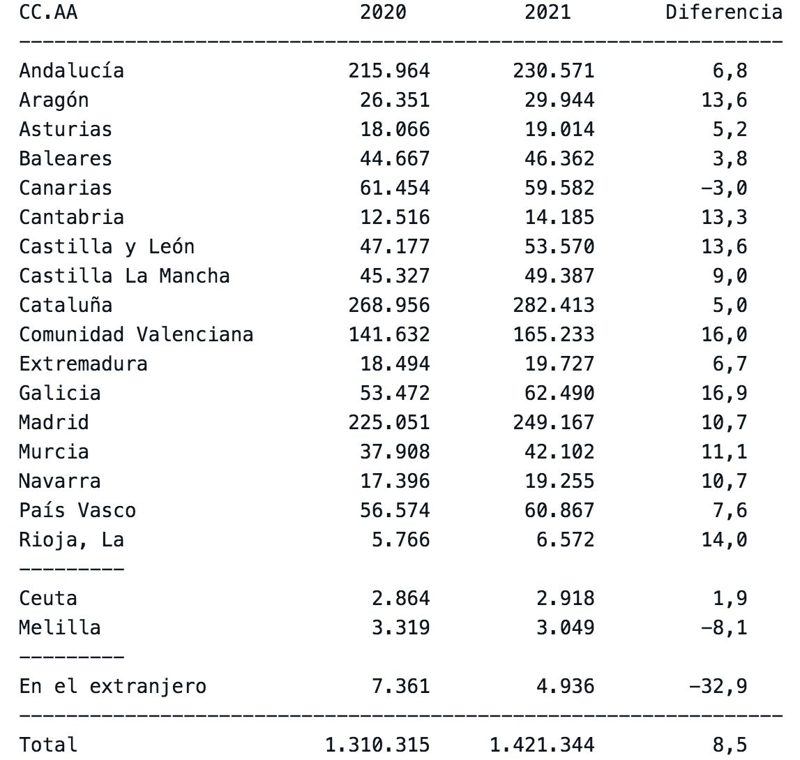 El siguiente cuadro recoge por comunidades autónomas el número de infracciones penales registradas hasta septiembre en 2020 y 2021 y la diferencia porcentual entre ambos periodos.