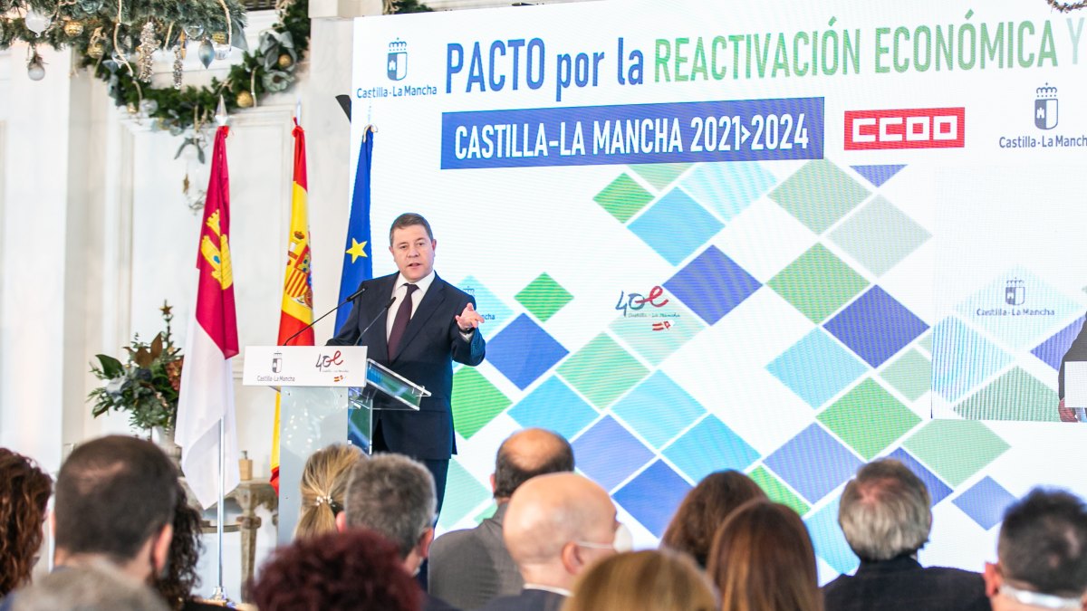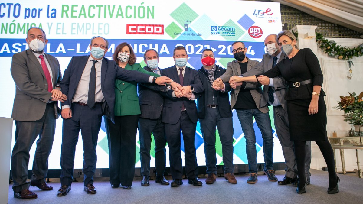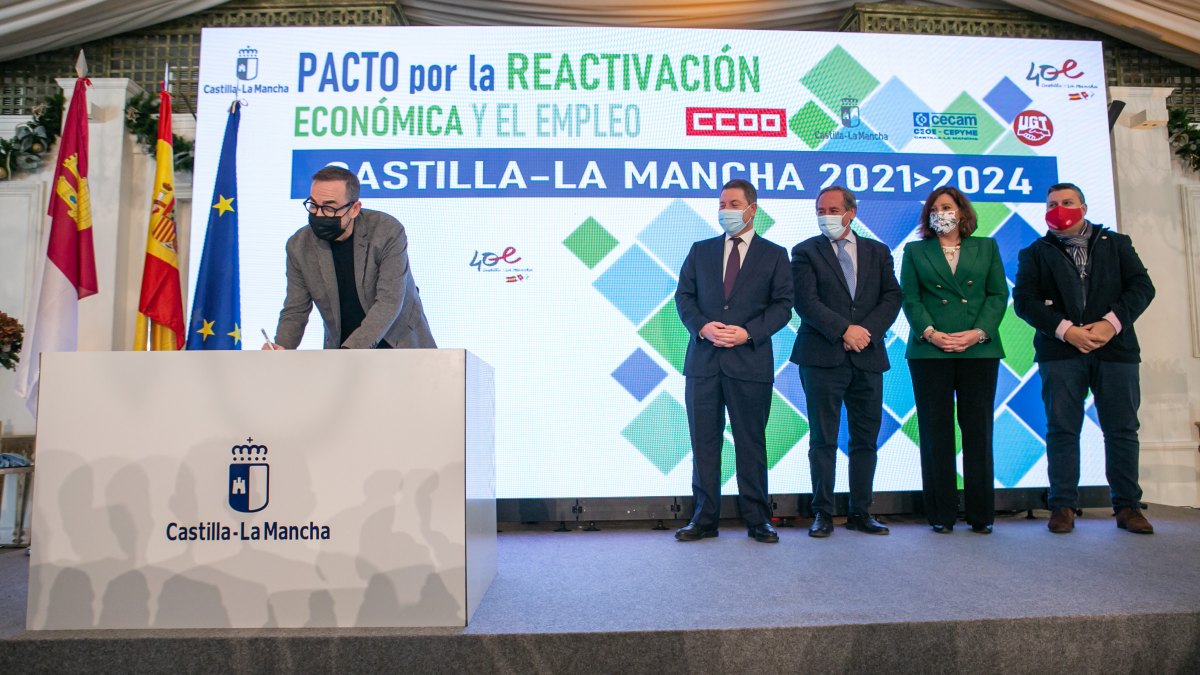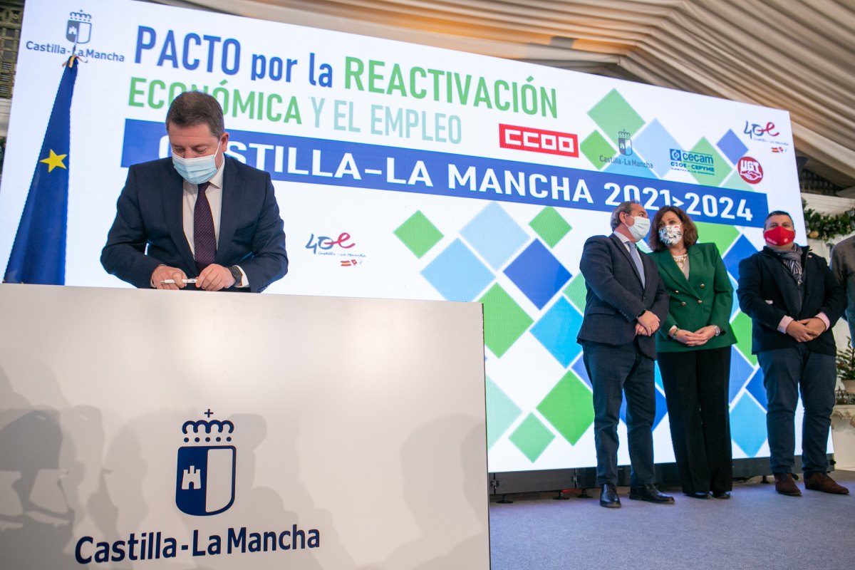El presidente de Castilla-La Mancha ha estado acompañado en la rúbrica del pacto por la consejera de Economía, Empresas y Empleo, Patricia Franco; el presidente de CECAM CEOE-CEPYME, Ángel Nicolás; el secretario regional de CCOO, Francisco de la Rosa; y el secretario de UGT en la región, Luis Manuel Monforte.