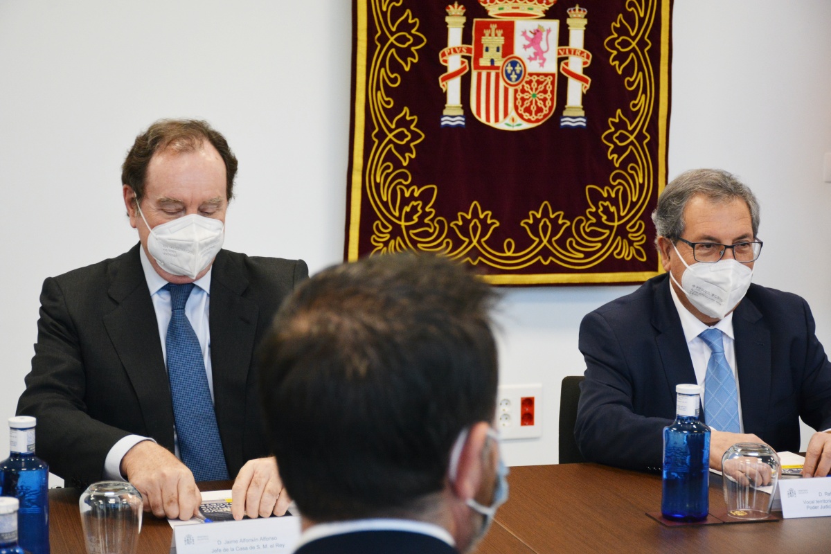 Su Majestad el Rey, que fue recibido a su llegada a la nueva sede del Ministerio de Asuntos Exteriores, Unión Europea y Cooperación por el ministro José Manuel Albares, mantuvo una reunión previa a su visita a la sede del Marqués de Salamanca, en la que pudo recorrer el área de la Dirección General de Españoles en el Exterior y Asuntos Consulares, el espacio de atención al usuario, auditorio y la sala de prensa., una vez concluida su rehabilitación.