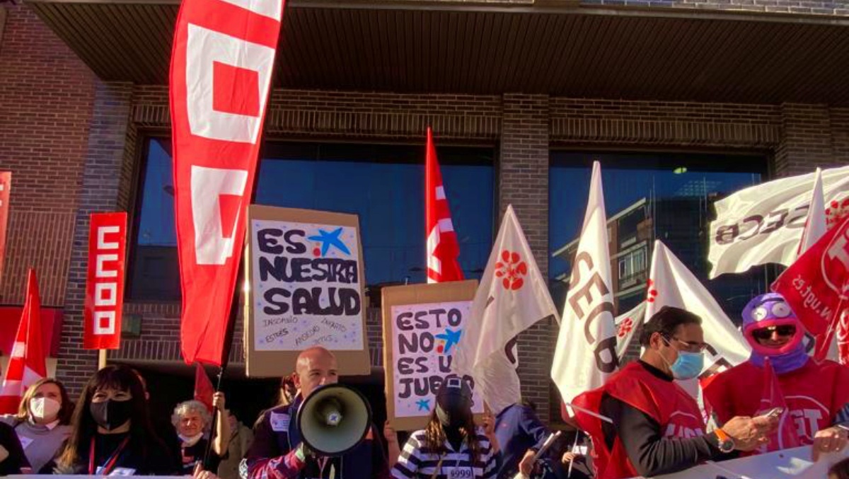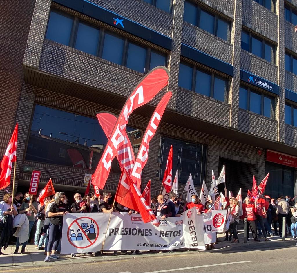 Para decir «basta» y exigir mejoras laborables, los sindicatos mayoritarios de CaixaBank, SECB, CCOO y UGT, han convocado a las 17:30 horas de este martes concentraciones en doce ciudades españolas (Barcelona, Bilbao, Mallorca, Burgos, Las Palmas, Madrid, Murcia, Pamplona, Sevilla, Tenerife, Toledo y Valencia) bajo el lema «- presiones, – retos, + medios».