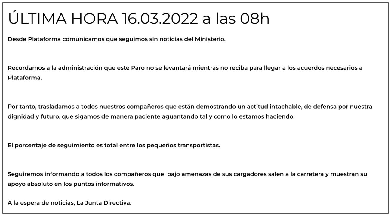 La Plataforma para la Defensa del Sector de Transporte de Mercancías, convocante de la huelga y protestas de transportistas, emitía en la mañana de este miércoles un comunicado en el que indicaba lo siguiente: