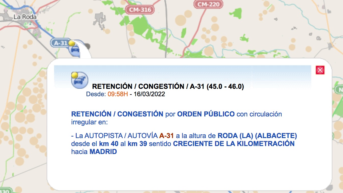 Dicha marcha lenta ha provocado retenciones en la autovía A-31 a su paso por La Roda, tal y como han confirmado a El Digital de Albacete fuentes del Subsector de Tráfico de la Guardia Civil de Albacete y recoge además la DGT en su mapa de incidencias del tráfico.
