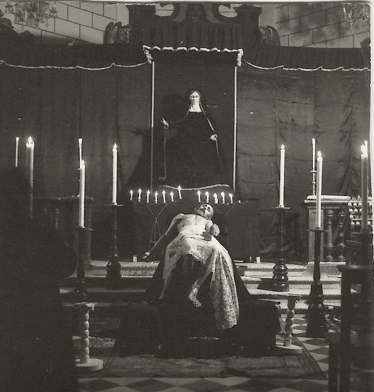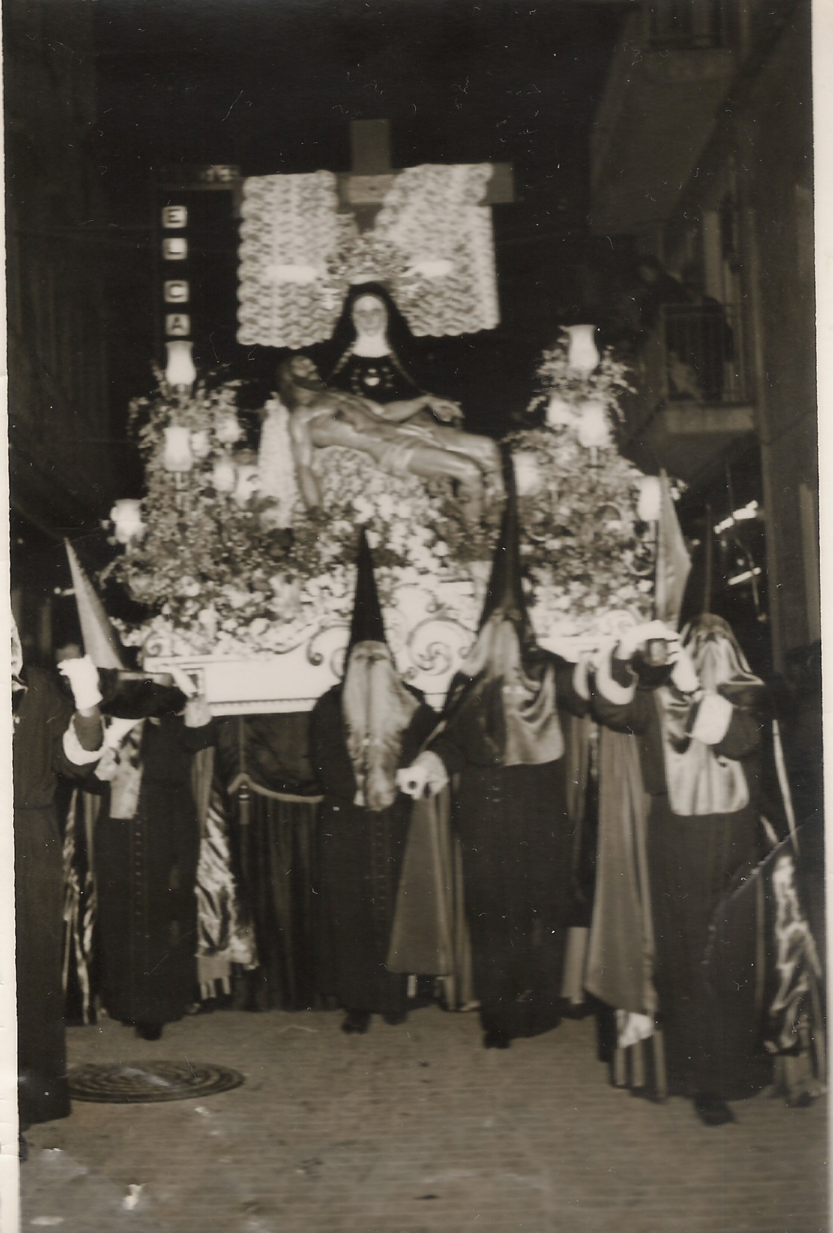 Sobre la imagen de Nuestra Señora de las Angustias confesaba Eduardo García que “es preciosa”. De este modo detallaba que se trata de un conjunto escultórico obra del conquense Luis Marco Pérez compuesto por “una piedad dolorosa que se sitúa a los pies de la cruz sosteniendo entre sus brazos el cuerpo sin vida de su hijo”.